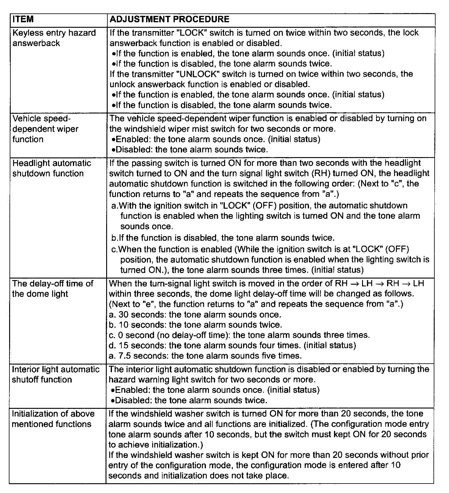 NOTE: The keyless entry hazard answerback can be also adjusted by operating the RKE transmitter. (however this adjustment can be done more easily by operating the transmitter.) Refer to Keyless Entry System - On-vehicle Service - Enabling/disabling the Answerback Function.