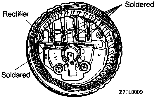 1. Use a soldering iron (180 to 250 W) to unsolder the stator. This work should complete within approximately four seconds to prevent heat from transferring to the diode.