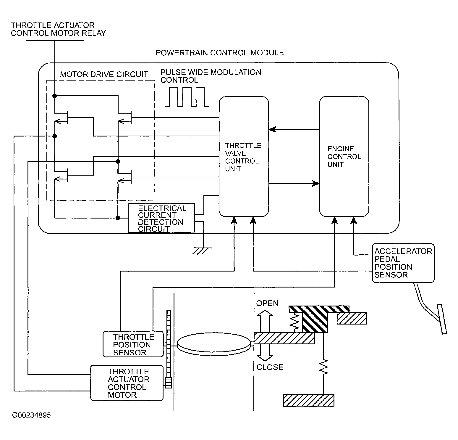 An electronically controlled throttle valve system, which electronically regulates throttle valve opening, is used. Engine control unit in Powertrain Control Module (PCM) monitors amount of accelerator pedal travel through accelerator pedal position sensor and issues premapped target throttle valve opening values to throttle actuator control unit in PCM in accordance with operating conditions. See Fig 1. Thus, throttle actuator control unit achieves target throttle valve opening by controlling current supplied to throttle actuator motor, which is attached to throttle body.