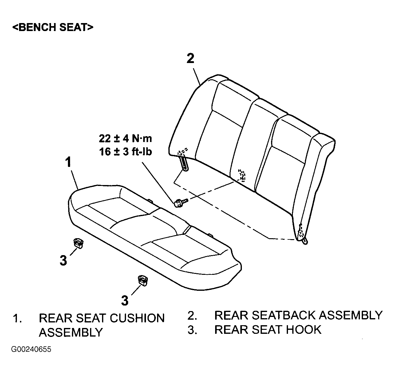 1. If vehicle is equipped with split rear seat, go to next step. If vehicle is equipped with bench rear seat, remove rear seat cushion assembly. See Figure. Remove rear seatback assembly and go to step  3.