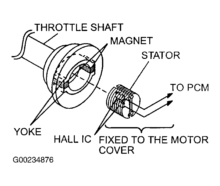 The Throttle Position (TP) sensor, which is located in throttle body, outputs a voltage signal, which corresponds to rotational angle of throttle shaft, to Powertrain Control Module (PCM). See Fig 1. In accordance with this signal, PCM effects feedback control of throttle actuator control motor. This TP sensor uses a non-contact Hall IC to enhance its reliability.