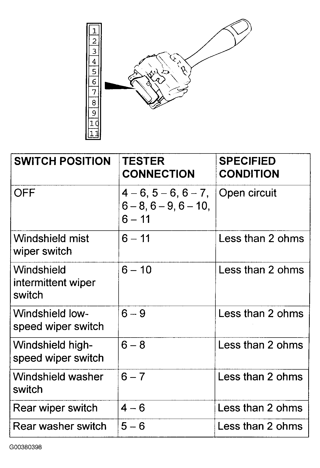 Remove the windshield wiper and washer switch. Then check continuity between the switch terminals. See Fig 1.