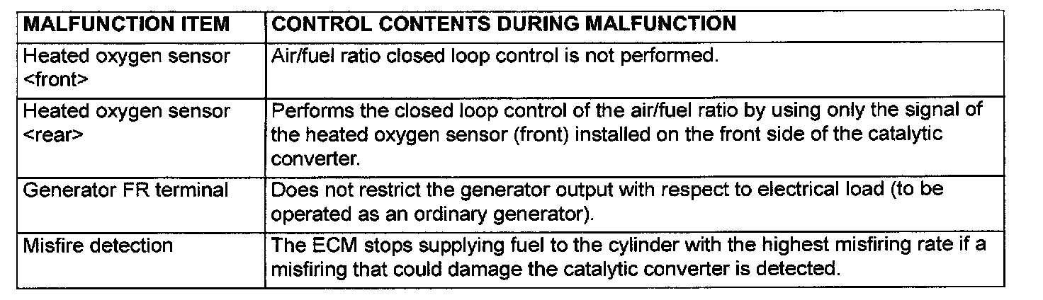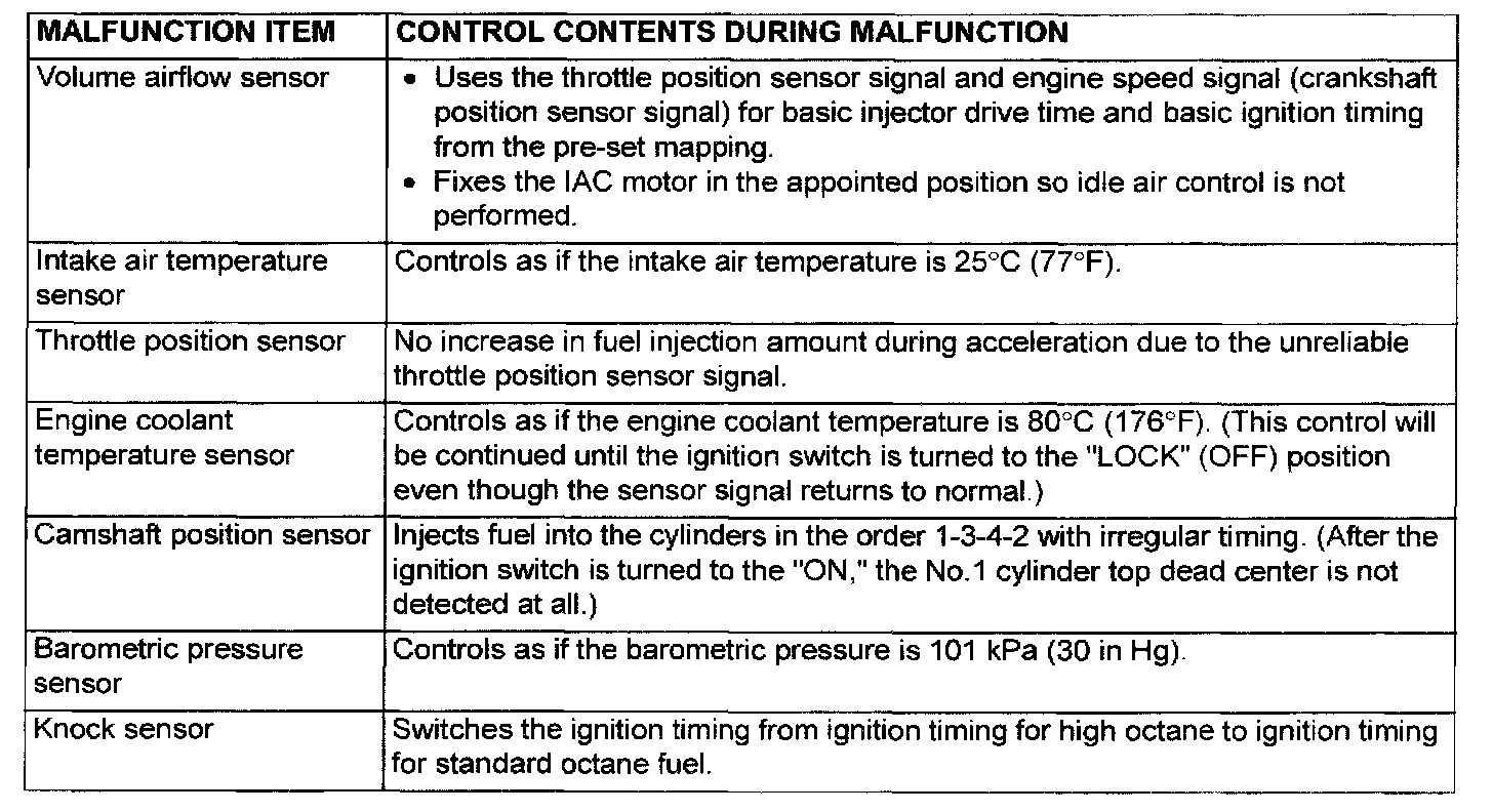 When the main sensor malfunctions are detected by the diagnostic test mode, the vehicle is controlled by means of the following defaults.