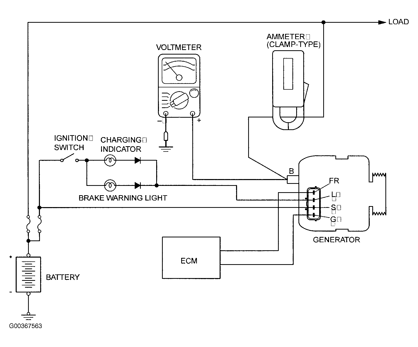 NOTE: If the electrical load is small while testing, the specified level of current may not be output even though the generator is normal. In such cases, increase the electrical load by leaving the headlights turned on for some time to discharge the battery or by using the lighting system in another vehicle, and then test again.