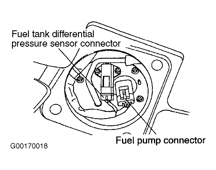 Release fuel pressure. See FUEL SYSTEM PRESSURE RELEASE . Working through access hole, cover fuel hose with a shop towel and disconnect fuel hoses at fuel pump module. Disconnect pressure sensor connector. See Figure. Remove fuel pump module fasteners. Remove fuel pump module assembly. See Figure.