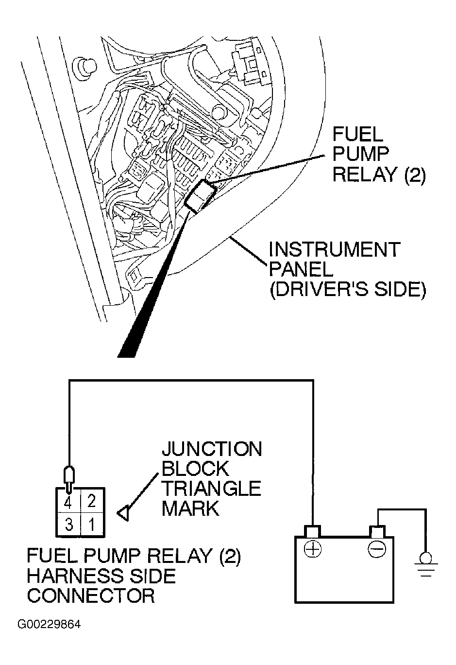 - Remove the fuel pump relay (2), and apply battery voltage to junction block side connector terminal No. 4. See Fig 1. Check that an operating sound can be heard from the fuel pump.NOTE: As the fuel pump is an in-tank type, the fuel pump sound is hard to hear. Remove the fuel tank filler tube cap and check from the tank inlet.