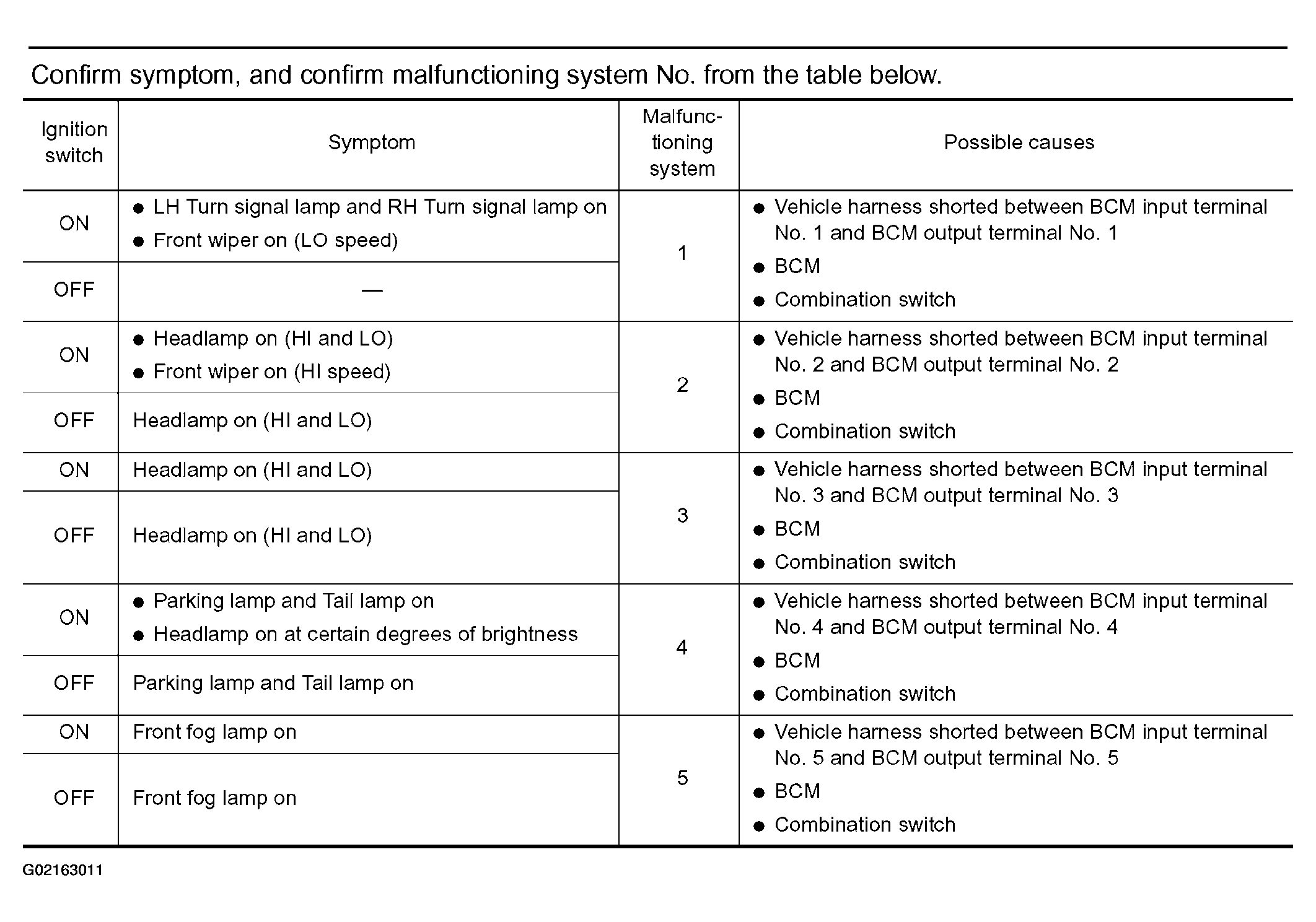 - NG: Check harness between BCM and combination switch for short circuit.