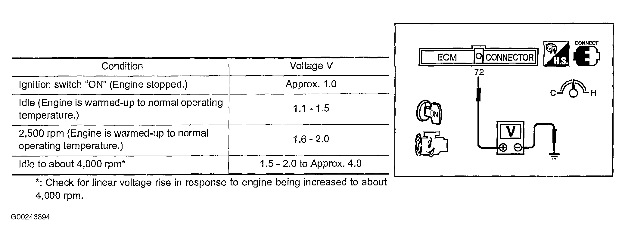 - Check voltage between ECM terminal No. 72 (Mass airflow sensor signal) for 2.5L and ECM terminal No. 62 (Mass airflow sensor signal) for 3.5L and ground, see Fig 1 - Fig 2 .