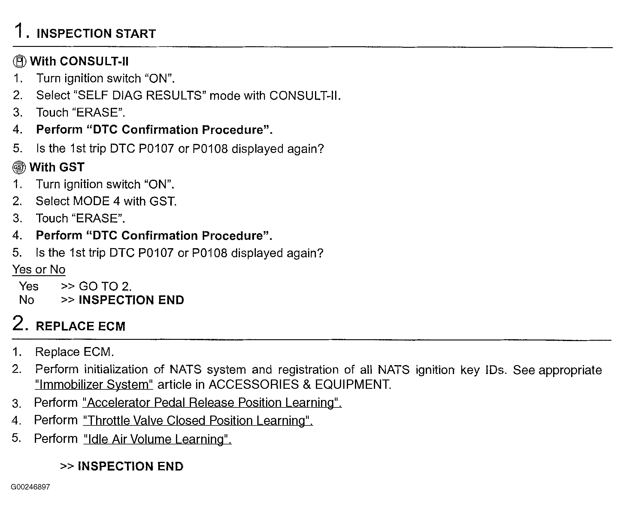 For accelerator pedal released position learning, see ACCELERATOR PEDAL RELEASED POSITION LEARNING under PROGRAMMING, for throttle valve closed position learning, see THROTTLE VALVE CLOSED POSITION LEARNING under PROGRAMMING and for idle air volume learning, see IDLE AIR VOLUME LEARNING under PROGRAMMING.