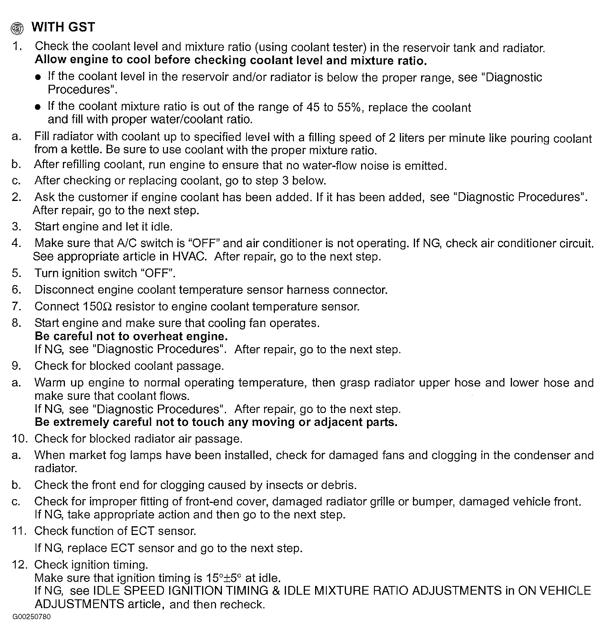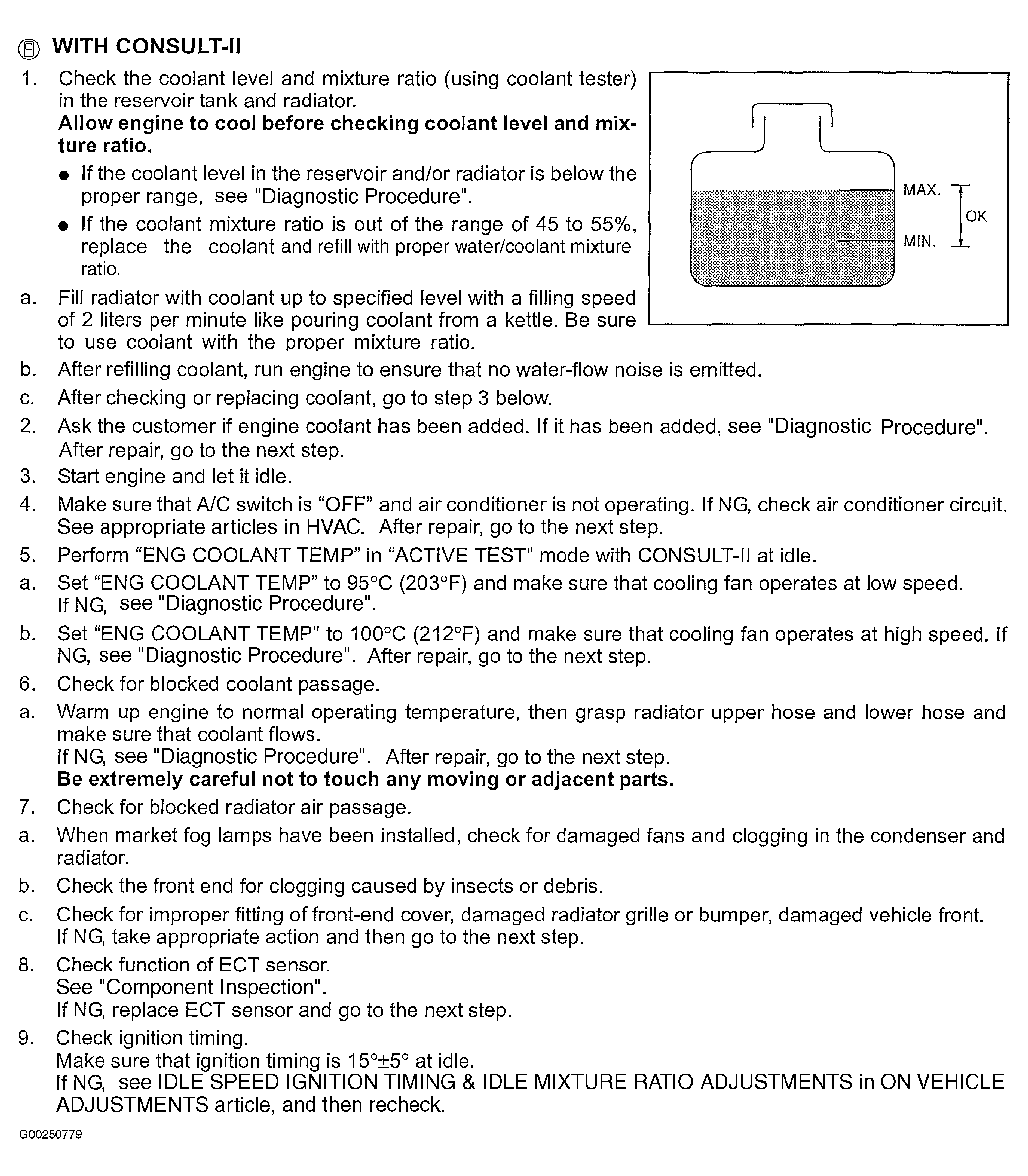For diagnostic procedure, see DIAGNOSTIC PROCEDURE , for ECT component inspection, see COMPONENT INSPECTION under DTC P0117 OR DTC P0118: ENGINE COOLANT TEMPERATURE SENSOR, for Idle speed, ignition timing and idle mixture ratio adjustment, see IDLE SPEED, IGNITION TIMING & IDLE MIXTURE RATIO ADJUSTMENT in ON-VEHICLE ADJUSTMENTS