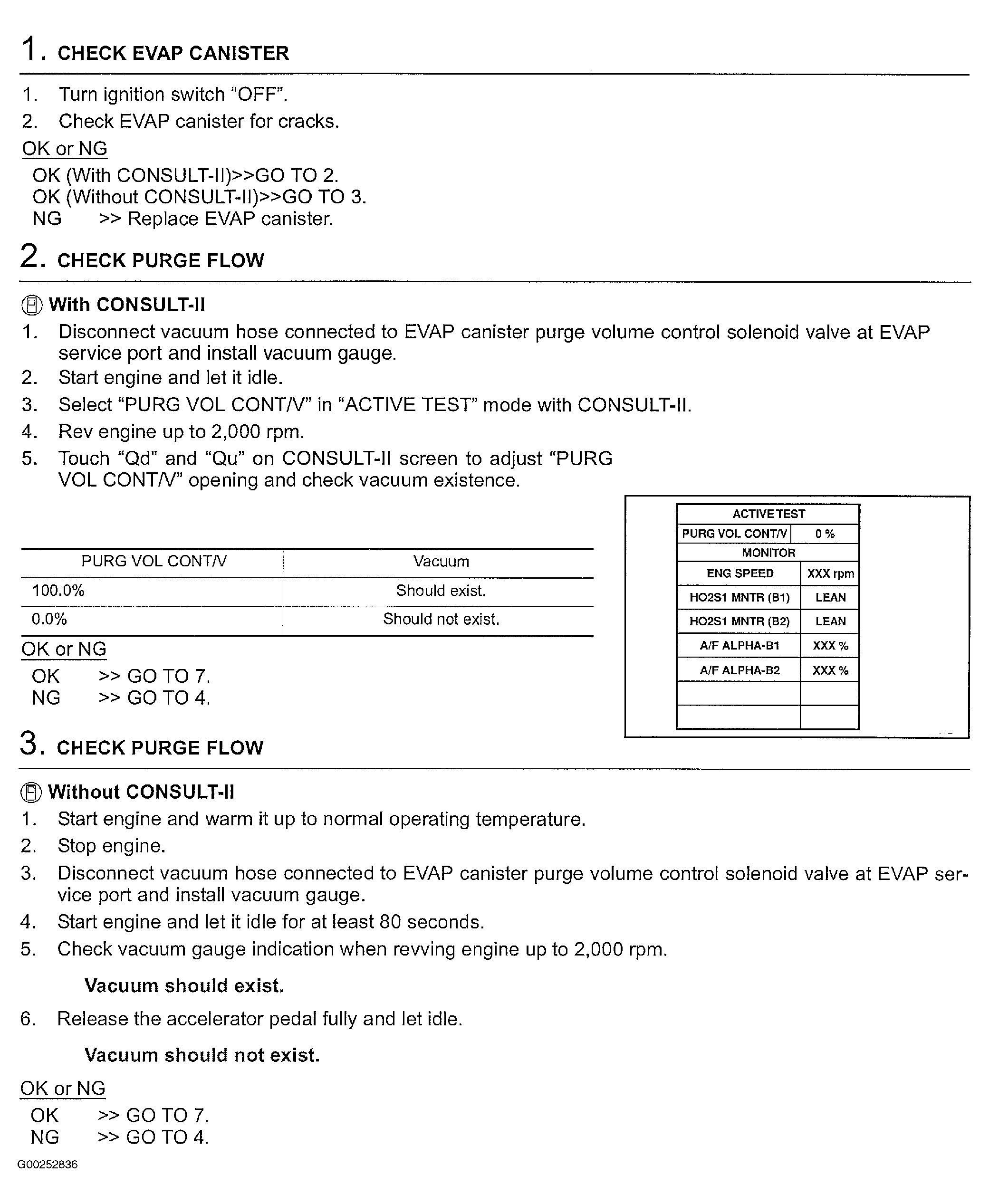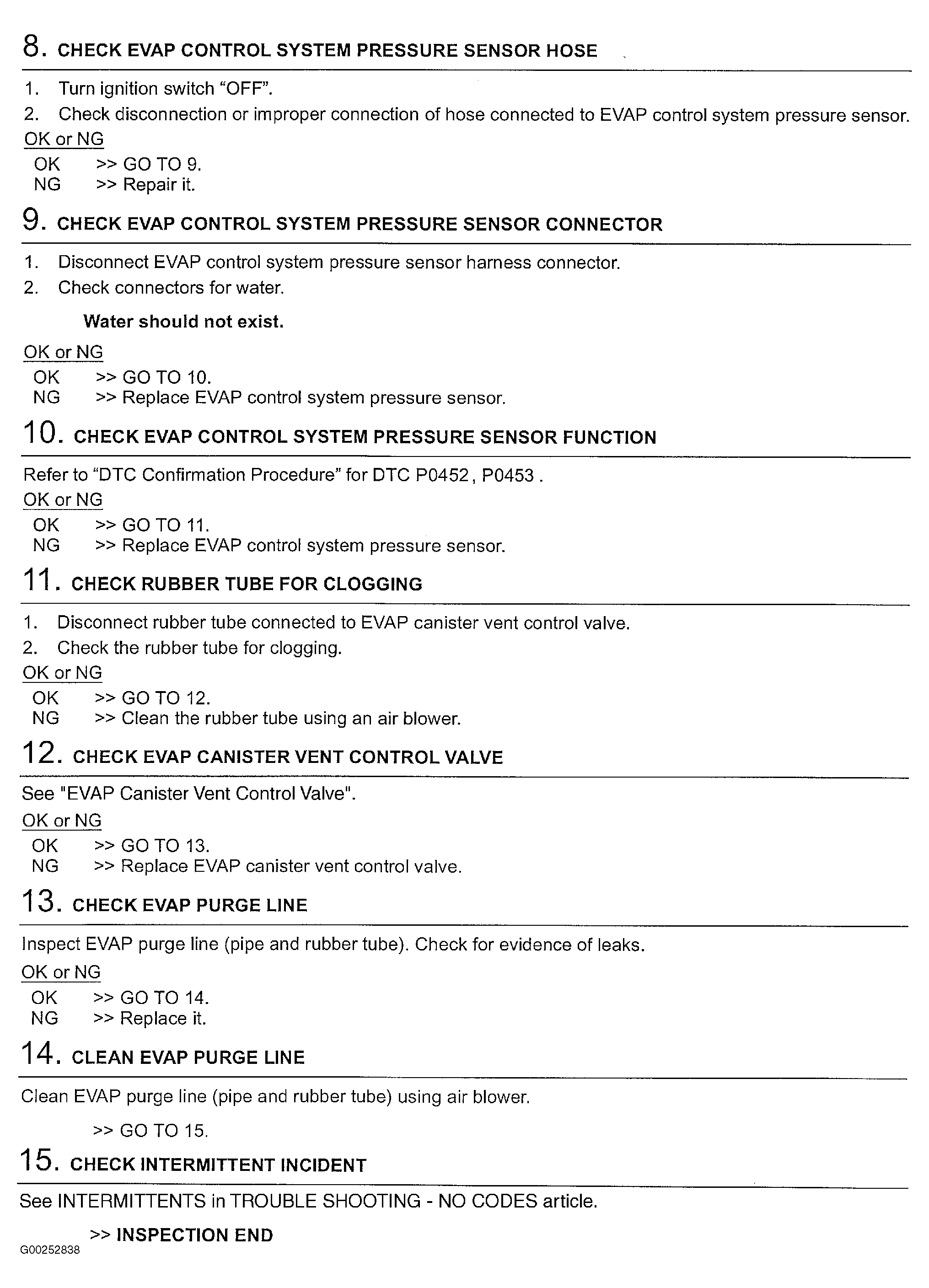 For EVAP canister purge volume control solenoid valve component inspection, see COMPONENT INSPECTION under DTC P0444 OR DTC P0445: EVAP CANISTER PURGE VOLUME CONTROL SOLENOID VALVE, for DTC confirmation procedure for DTC P0452, see DTC CONFIRMATION TEST (WITH CONSULT-II) under DTC P0452: EVAP CONTROL SYSTEM PRESSURE SENSOR, For DTC confirmation procedure for DTC P0453, see DTC CONFIRMATION PROCEDURE under DTC P0453: EVAP CONTROL SYSTEM PRESSURE SENSOR, for EVAP canister vent control valve component inspection, see COMPONENT INSPECTION under DTC P0447: EVAP CANISTER VENT CONTROL VALVE and for intermittents, see INTERMITTENTS in TROUBLE SHOOTING - NO CODES