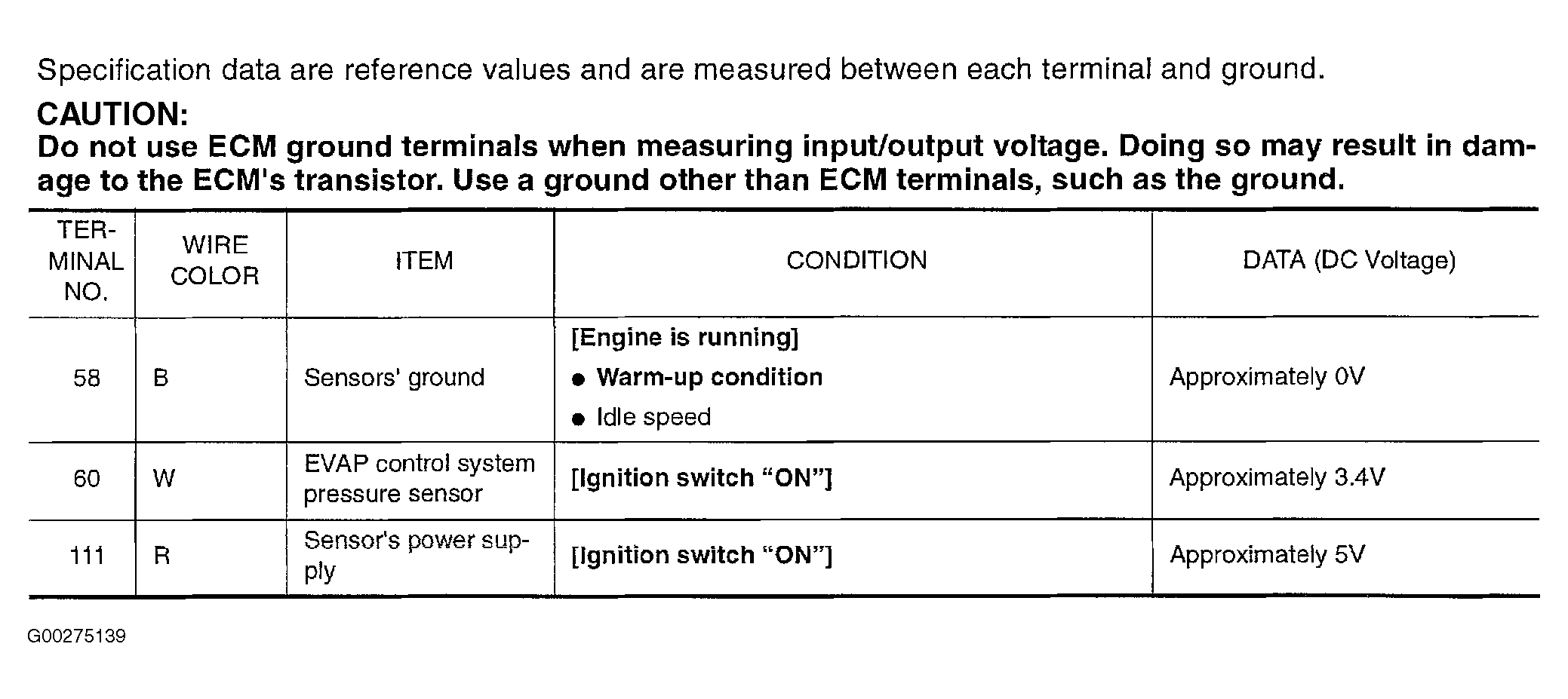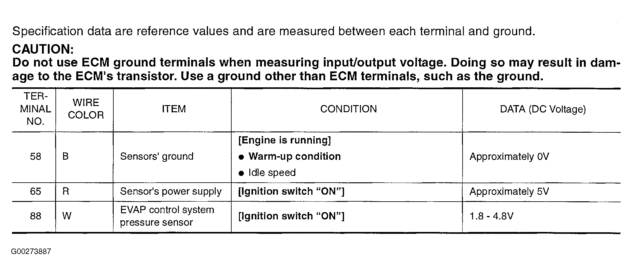 Fig 1: Circuit Testing Value Chart For EVAP Control System Pressure Sensor (2.5L)
