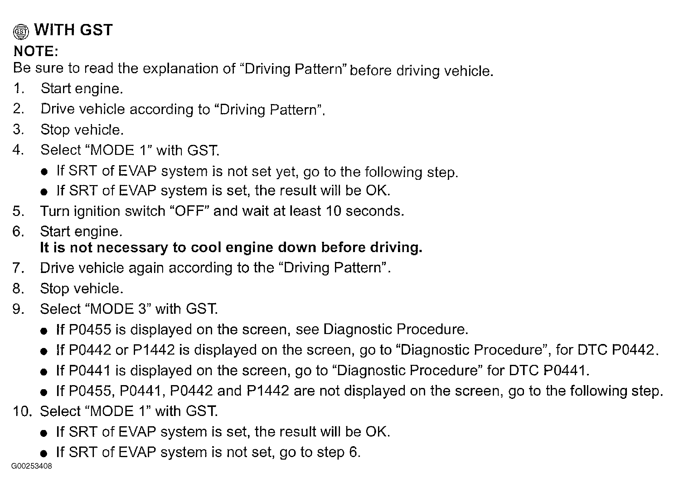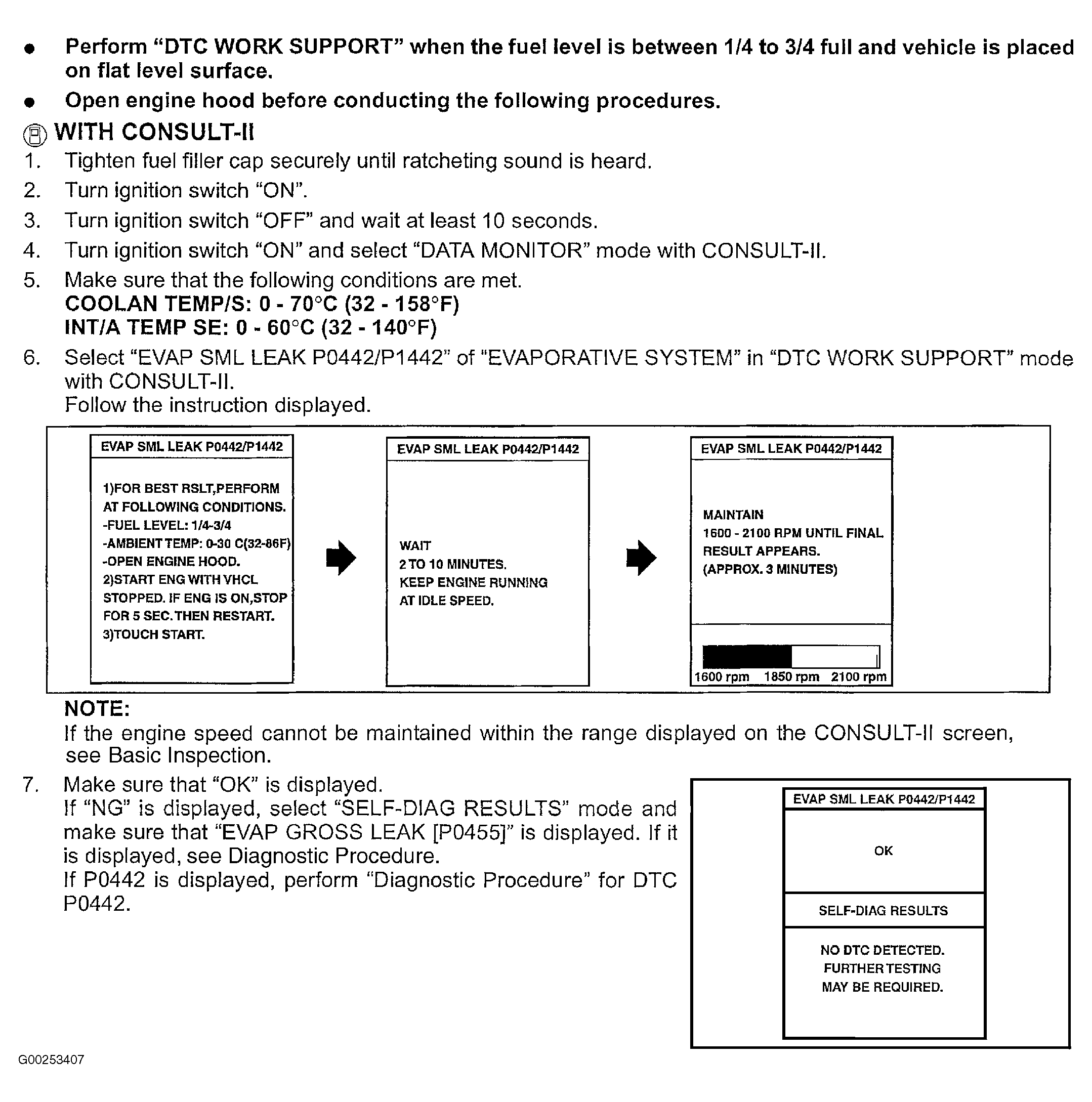 article, for diagnostic procedure, see DIAGNOSTIC PROCEDURE , for driving pattern, see SYSTEM READINESS TEST in DRIVE CYCLES, for diagnostic procedure for DTC P0442, see DIAGNOSTIC PROCEDURE (2.5L) or DIAGNOSTIC PROCEDURE (3.5L)