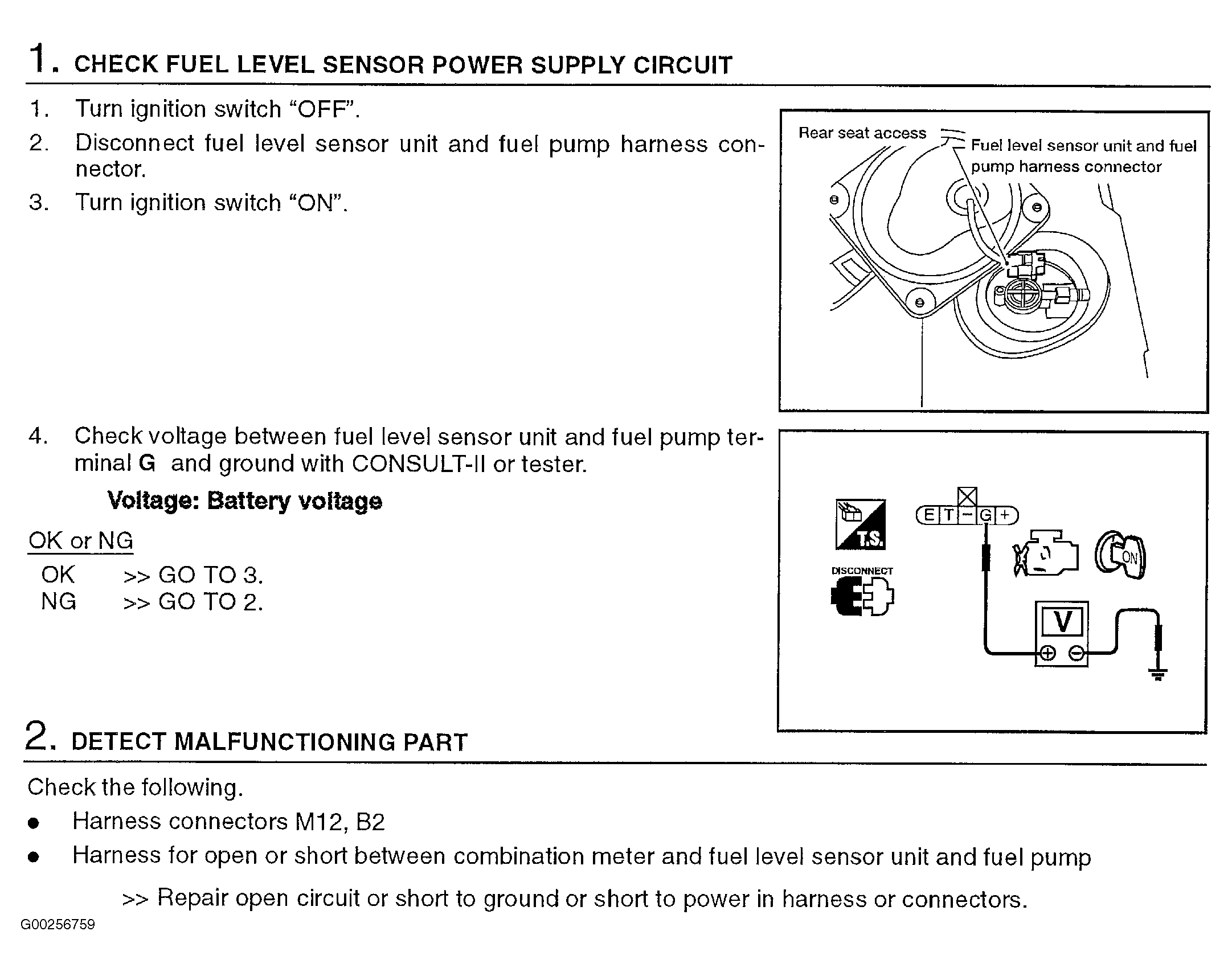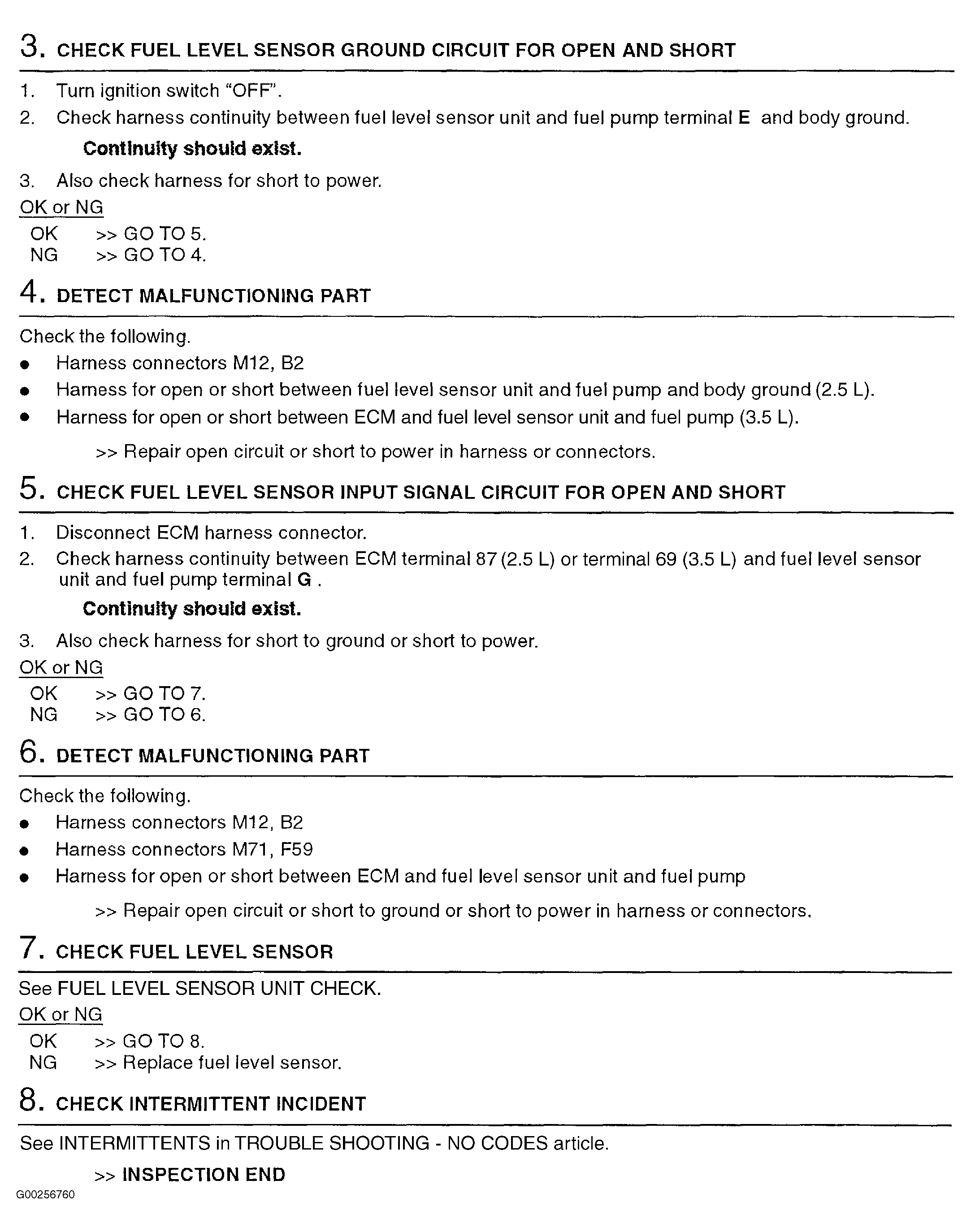 For fuel level sensor unit check, see, see FUEL LEVEL SENSOR UNIT CHECK under COMPONENT TESTS in INSTRUMENT PANELS - ALTIMA article and for intermittents, see INTERMITTENTS in TROUBLE SHOOTING - NO CODES