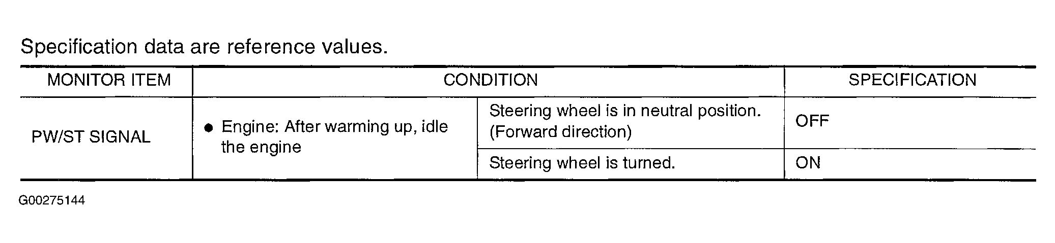 Home >> Mitsubishi >> 2003 >> Lancer Evolution >> Repair and Diagnosis >> External Pages >> Different car >> Section 82 (Engine Controls - Self-Diagnostics) >> Diagnostic Tests >> DTC P0550: Power Steering Pressure Sensor (3.5L) >> CONSULT-II Reference Value In Data Monitor Mode