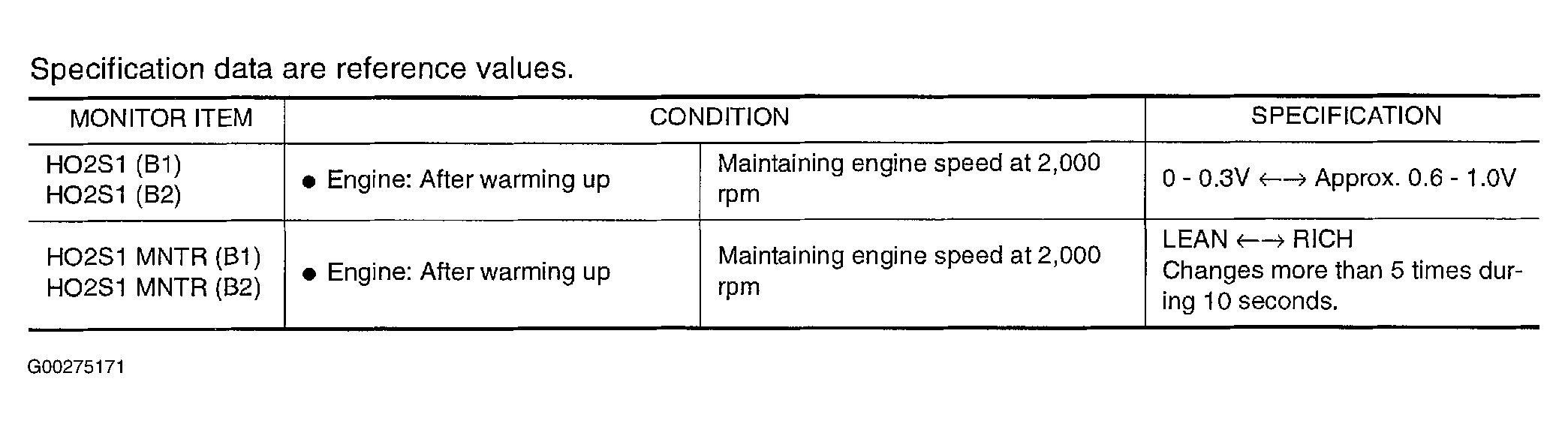 Home >> Mitsubishi >> 2003 >> Lancer Evolution >> Repair and Diagnosis >> External Pages >> Different car >> Section 82 (Engine Controls - Self-Diagnostics) >> Diagnostic Tests >> DTC P1143: Ho2S1 Lean Shift Monitoring - Bank 1 Or DTC P1163: Ho2S1 Lean Shift Monitoring - Bank 2 >> CONSULT-II Reference Value In Data Monitor Mode