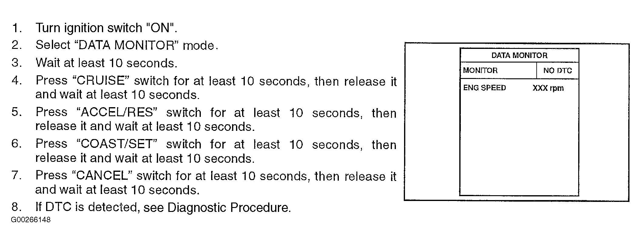 Home >> Mitsubishi >> 2003 >> Lancer Evolution >> Repair and Diagnosis >> External Pages >> Different car >> Section 82 (Engine Controls - Self-Diagnostics) >> Diagnostic Tests >> DTC P1564: Automatic Speed Control Device (ASCD) Steering Switch >> DTC Confirmation Procedure