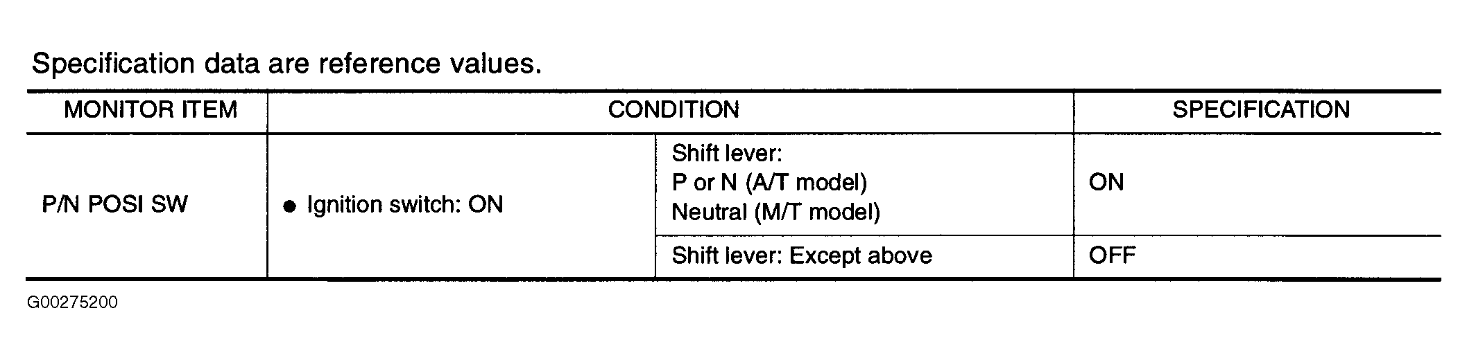 Home >> Mitsubishi >> 2003 >> Lancer Evolution >> Repair and Diagnosis >> External Pages >> Different car >> Section 82 (Engine Controls - Self-Diagnostics) >> Diagnostic Tests >> DTC P1706: Park/Neutral Position Switch >> CONSULT-II Reference Value In Data Monitor Mode