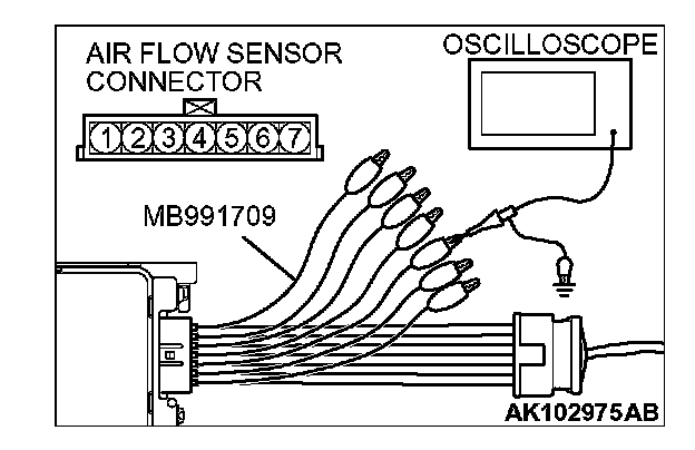 1. Disconnect the volume air flow sensor connector, and connect the test harness special tool (MB991709) in between. (All terminals should be connected.)