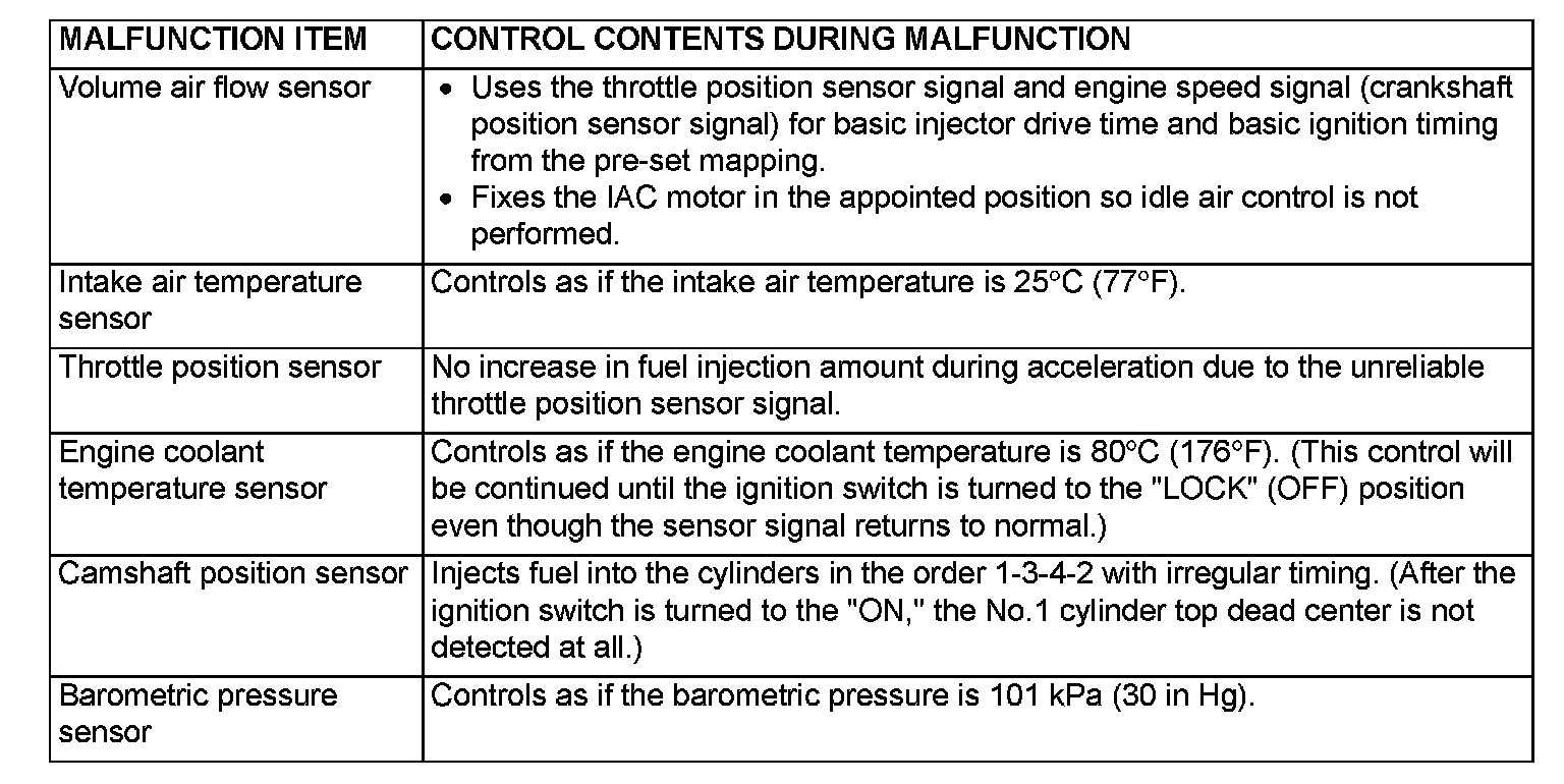 When the main sensor malfunctions are detected by the diagnostic test mode, the vehicle is controlled by means of the given defaults.