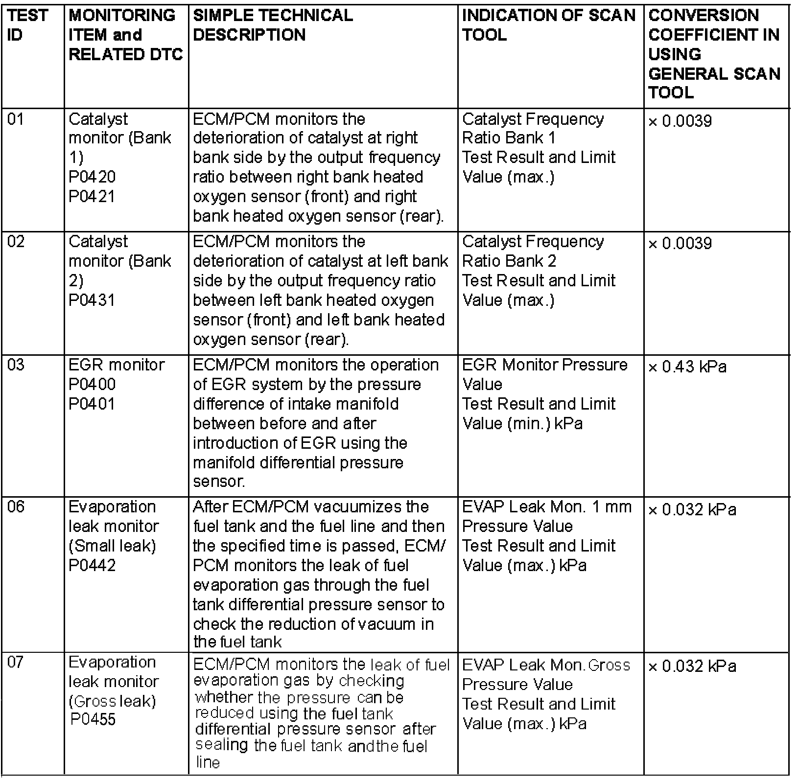 NOTE: By selecting MODE 06 using a scan tool, Test Result and Limit Value minimum (*1) or maximum (*2) about the main items of the emission control system, which the ECM/PCM monitors, can be confirmed. The value at the last monitoring is output by ECM/PCM as a test result.