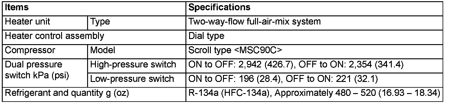 Home >> Mitsubishi >> 2003 >> Lancer L4-2.0L SOHC >> Repair and Diagnosis >> Specifications >> Mechanical Specifications >> Heating and Air Conditioning >> System Specifications