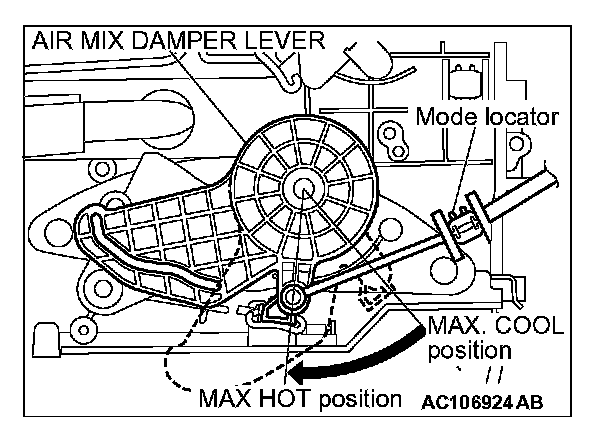2. Set the heater unit's air mix door lever to the MAX HOT position (turn the damper lever as the left illustration) and attach the cable.