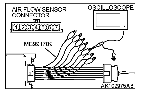 1. Disconnect the volume air flow sensor connector, and connect the test harness special tool (MB991709) in between. (All terminals should be connected.)