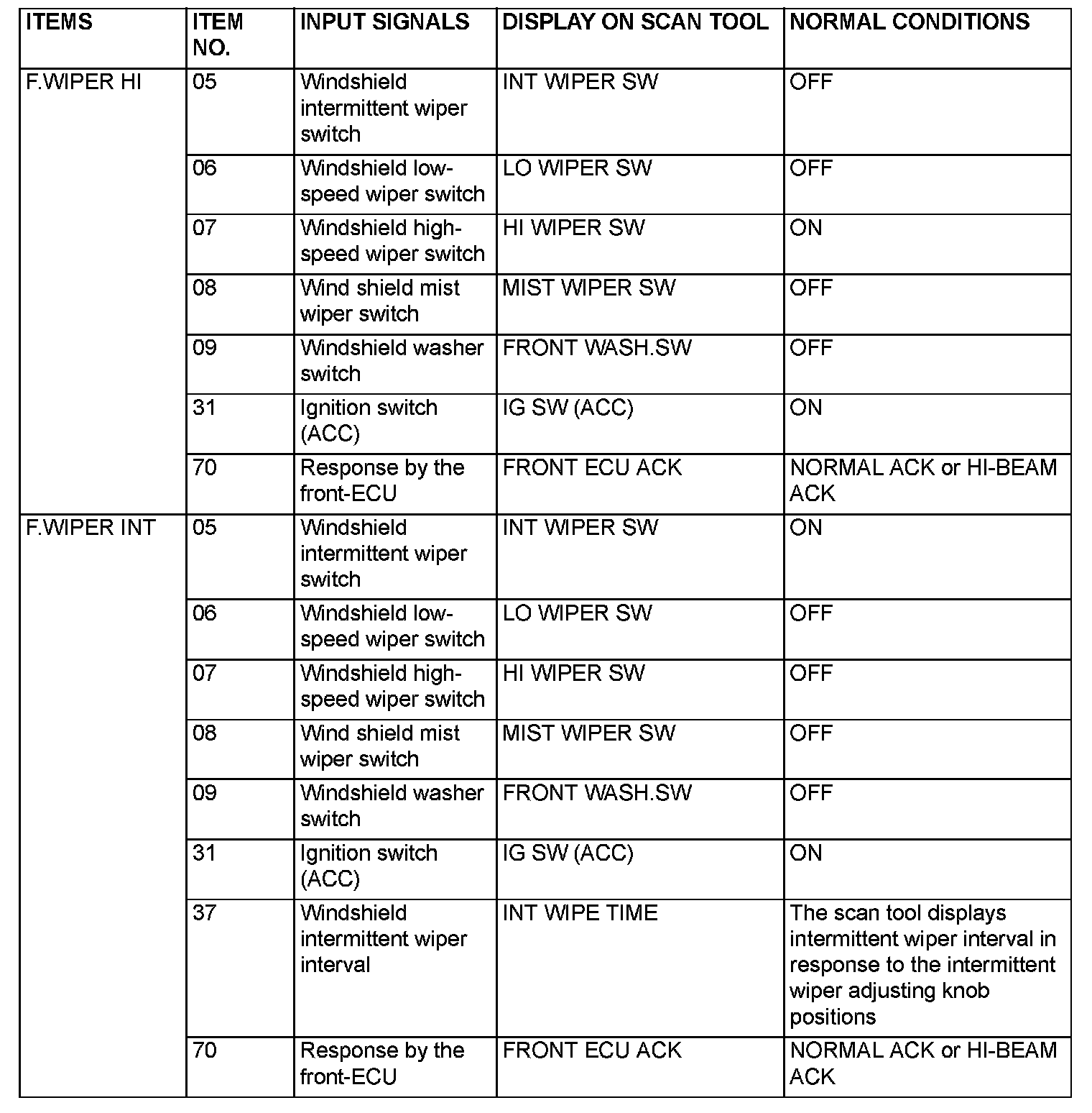 For checking item "HI (High-beam)", the scan tool displays "OFF" on the item No. 2 "Dimmer SW" when the headlights are at high-beam. Therefore, the scan tool should display "ON" momentarily when the dimmer switch is operated.