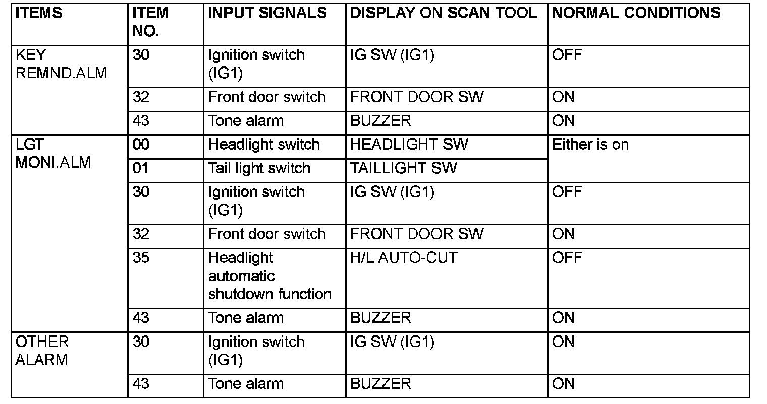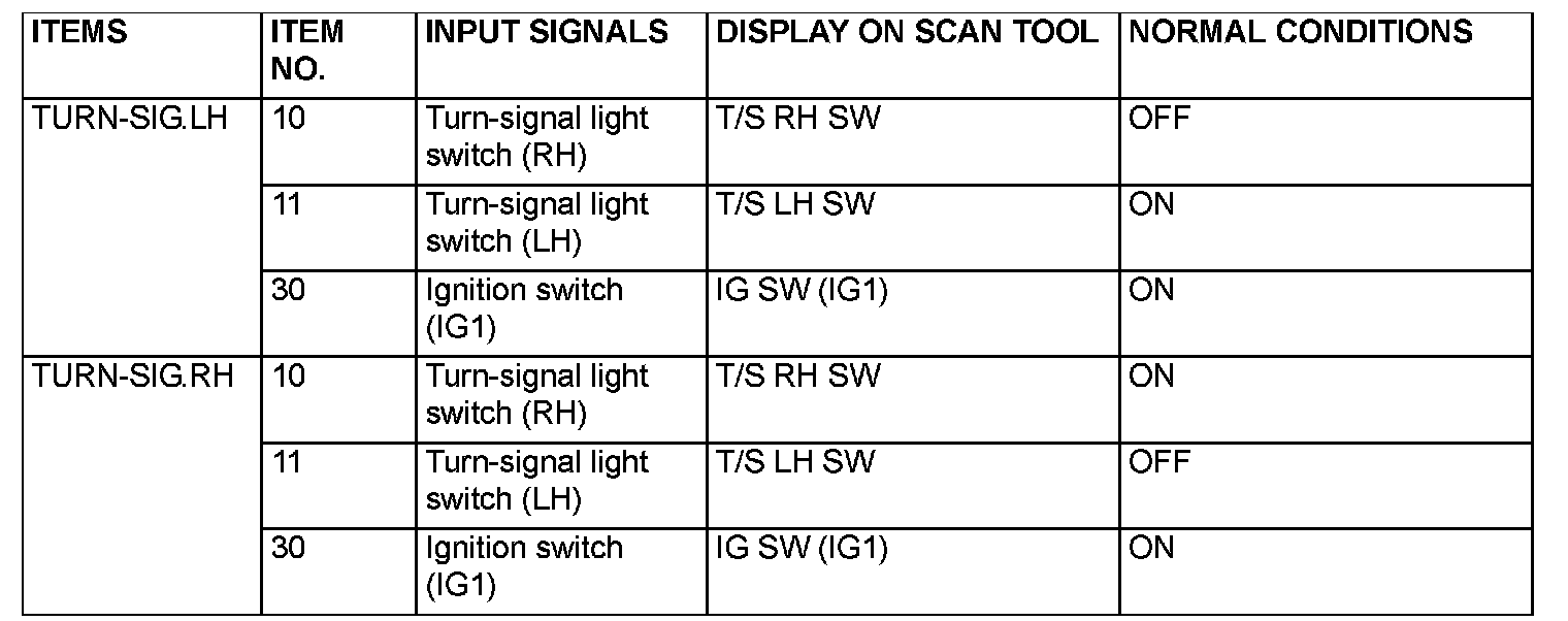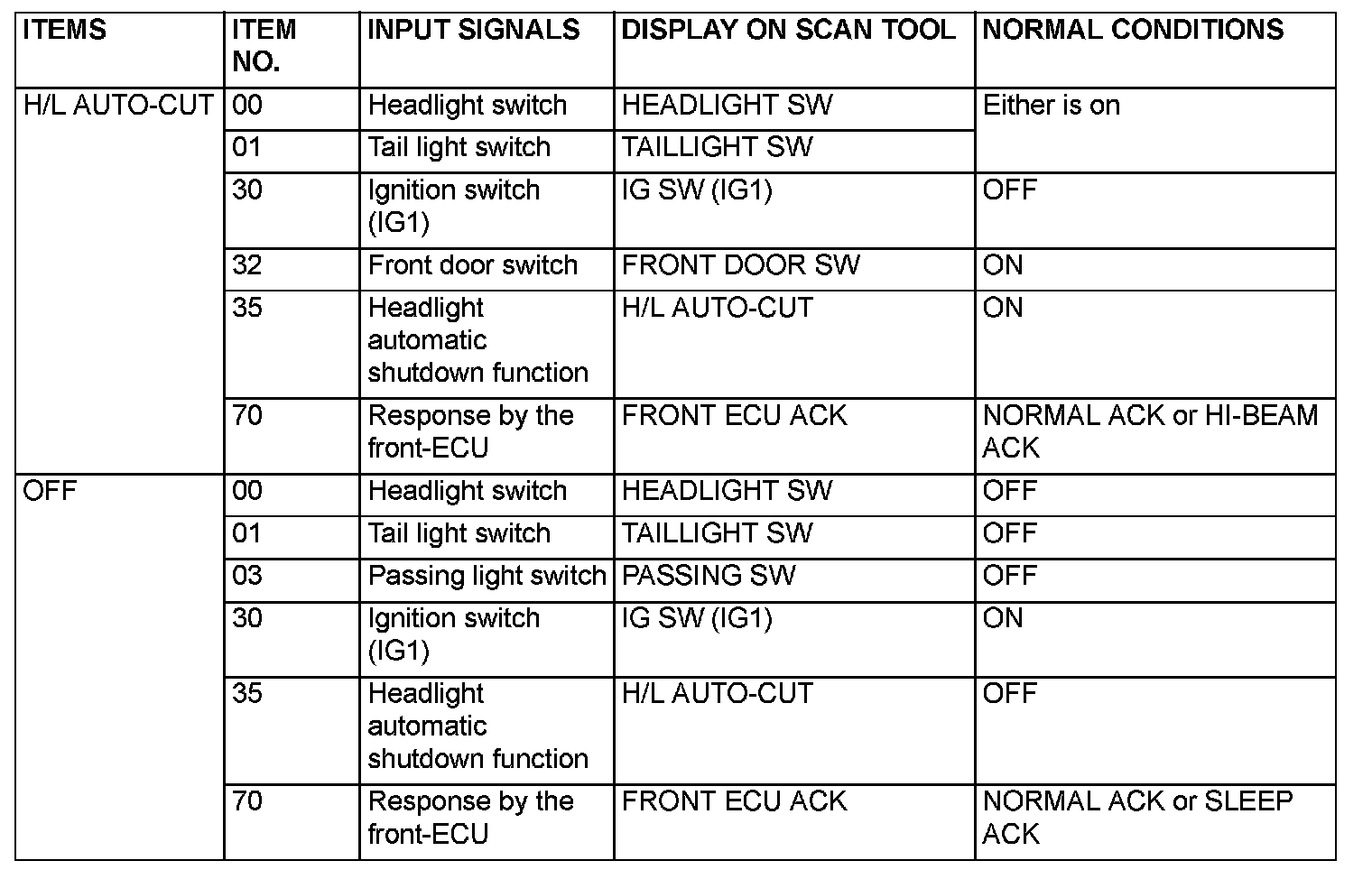 NOTE: When checking the input signals (off, tail, low-beam or high-beam), turn the ignition switch to the "ON" position in order to disable the headlight automatic shutdown function. However, the headlight operation does not depend on the ignition switch positions, the scan tool does not display the title "IGNITION SWITCH".