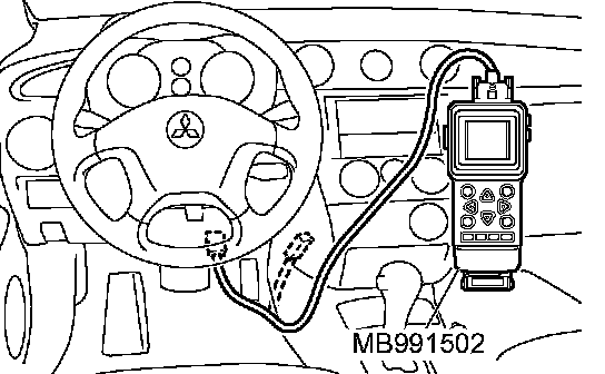 CAUTION: To prevent damage to scan tool MB991502, always turn the ignition switch to the "LOCK" (OFF) position before connecting or disconnecting scan tool.