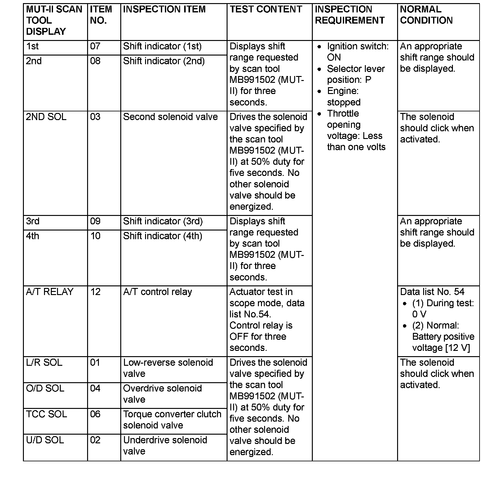 Actuator Test Reference Table