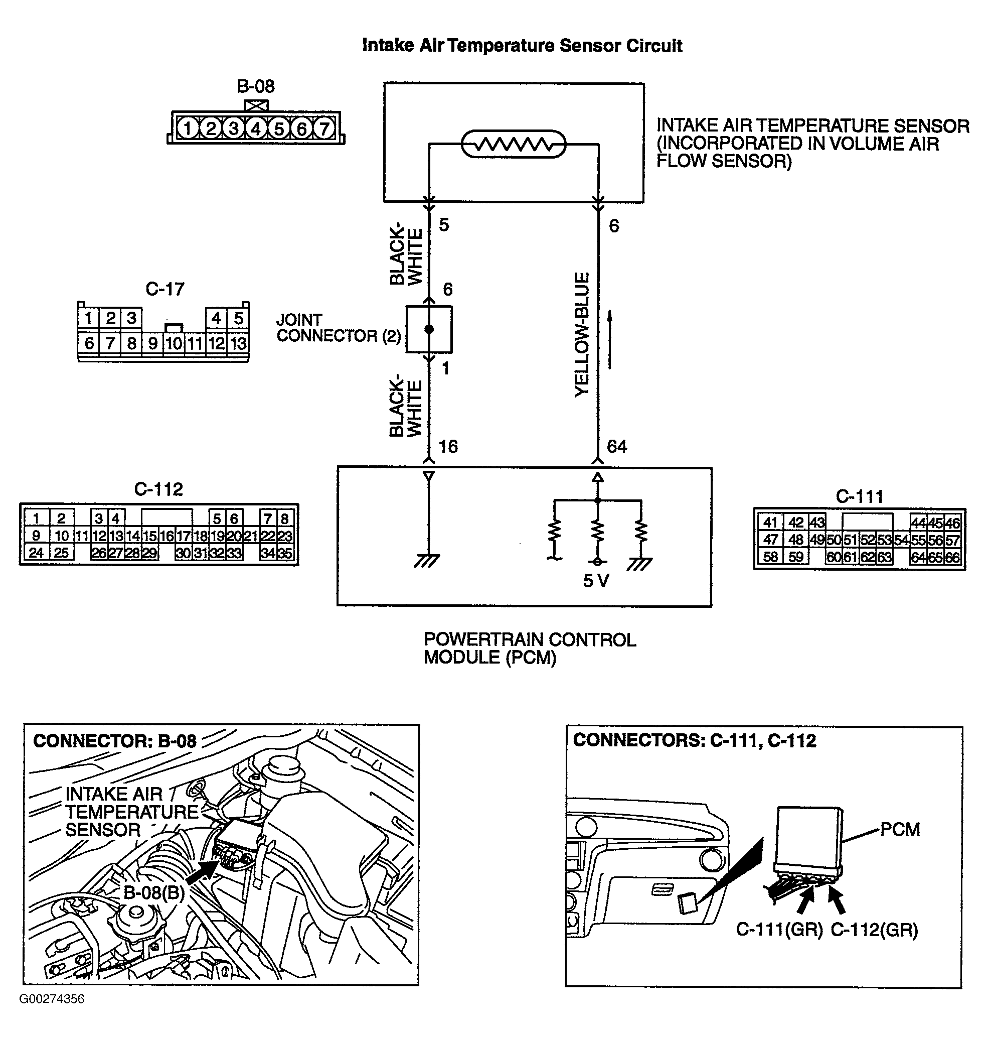 About 5 volts are applied to the IAT sensor output terminal (terminal No. 6) from the PCM (terminal No. 64) via the resistor in the PCM. The ground terminal (terminal No. 5) is grounded with PCM (terminal No. 16). The IAT sensor is a negative temperature coefficient type of resistor. When the intake air temperature rises, the resistance decreases. The IAT sensor output voltage increases when the resistance increases and decreases when the resistance decreases. See Figure .