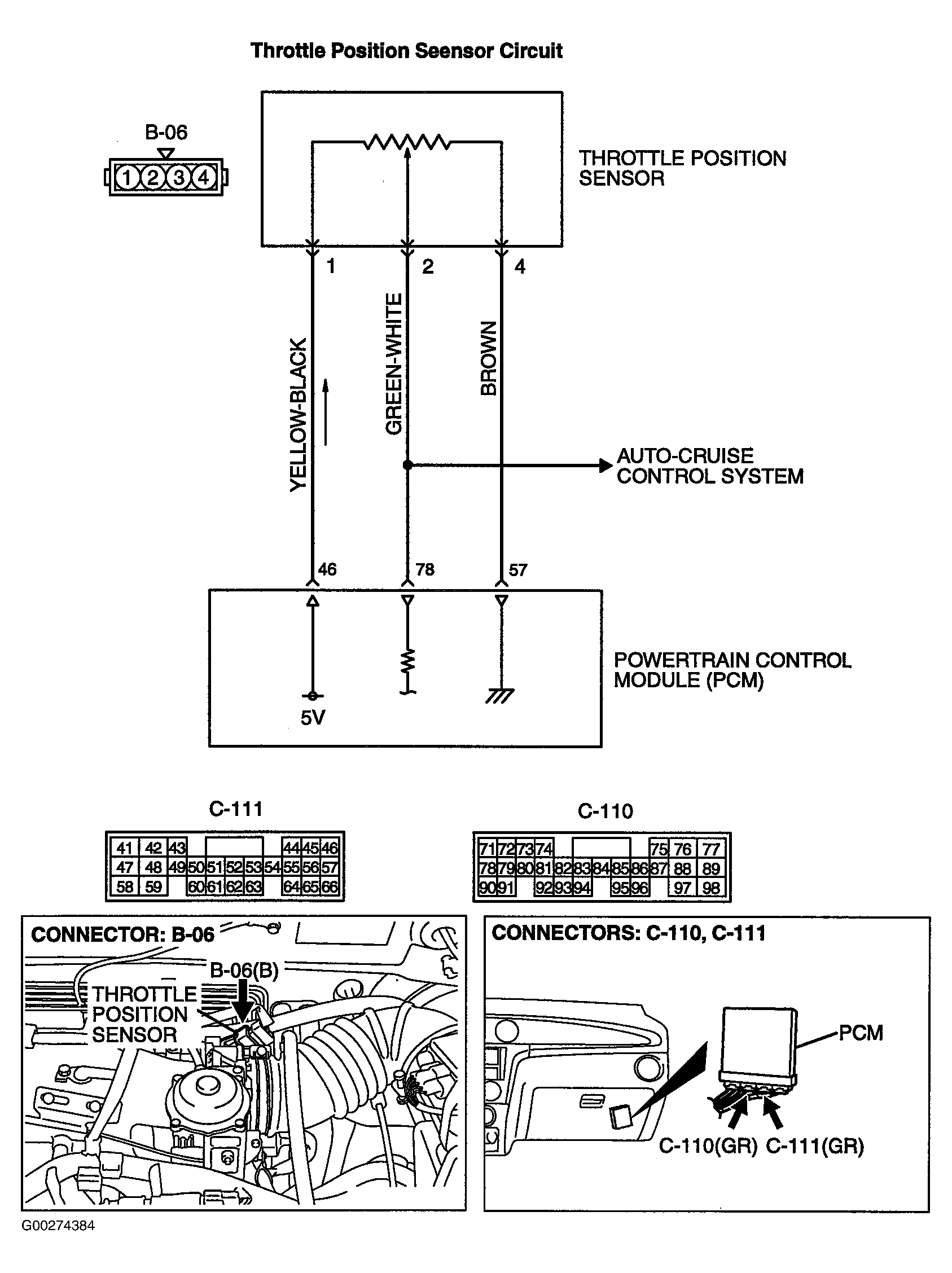 A 5-volt power supply is applied on the TP sensor power terminal (terminal No. 1) from the PCM (terminal No. 46). The ground terminal (terminal No. 4) is grounded with PCM (terminal No. 57). When the throttle valve shaft is turned from the idle position to the fully opened position, the resistor between the TP sensor output terminal (terminal No. 2) and ground terminal will increase according to the rotation. See Figure .