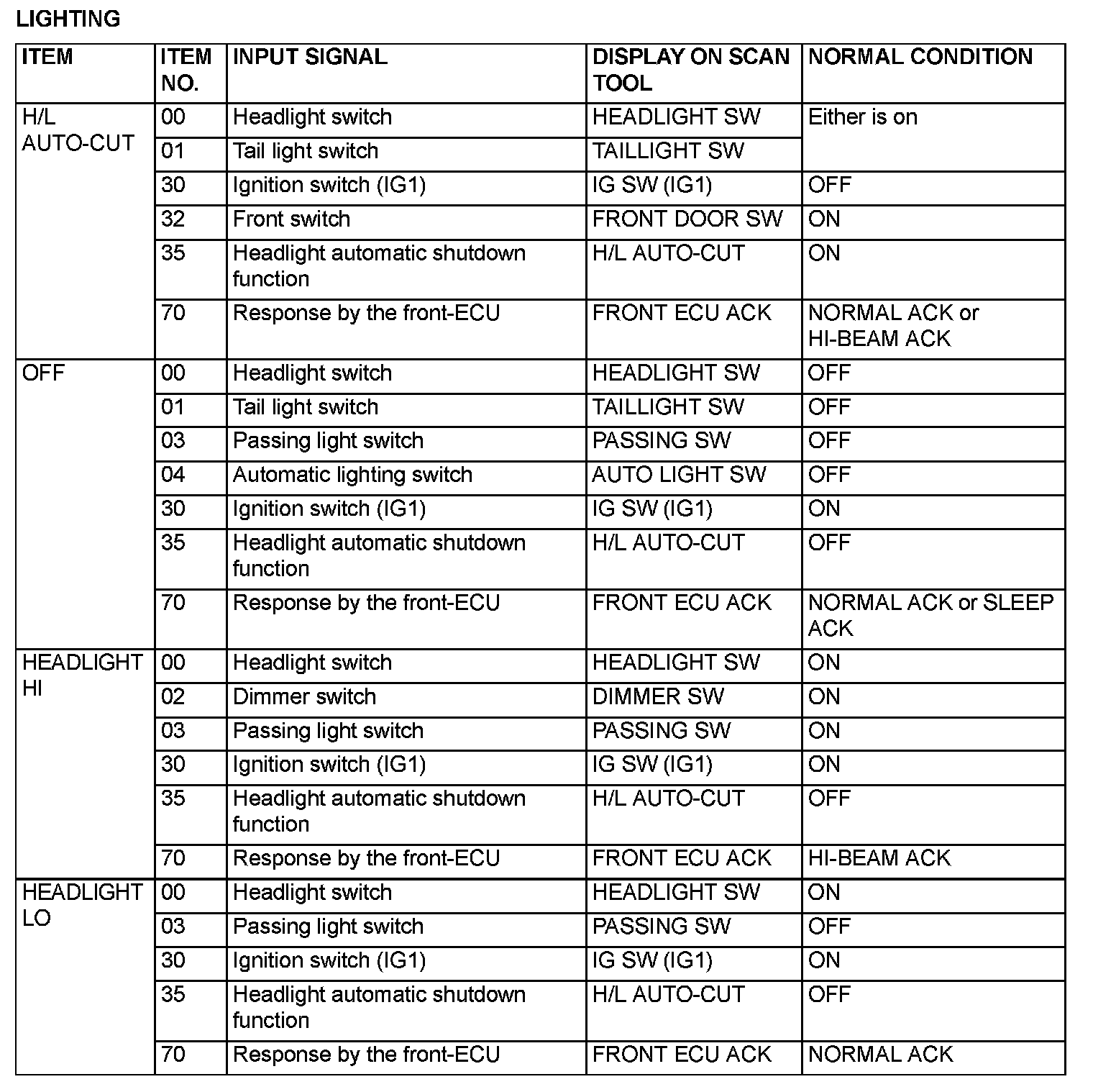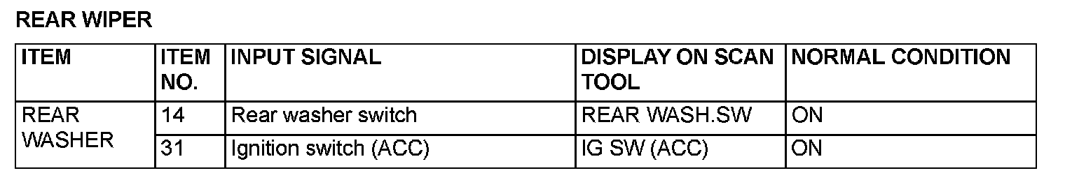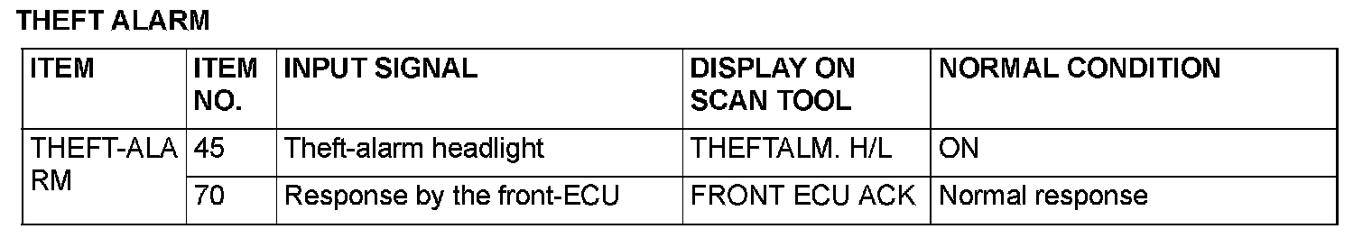 The table shows the service data and their normal condition, which are displayed during the "Data List."