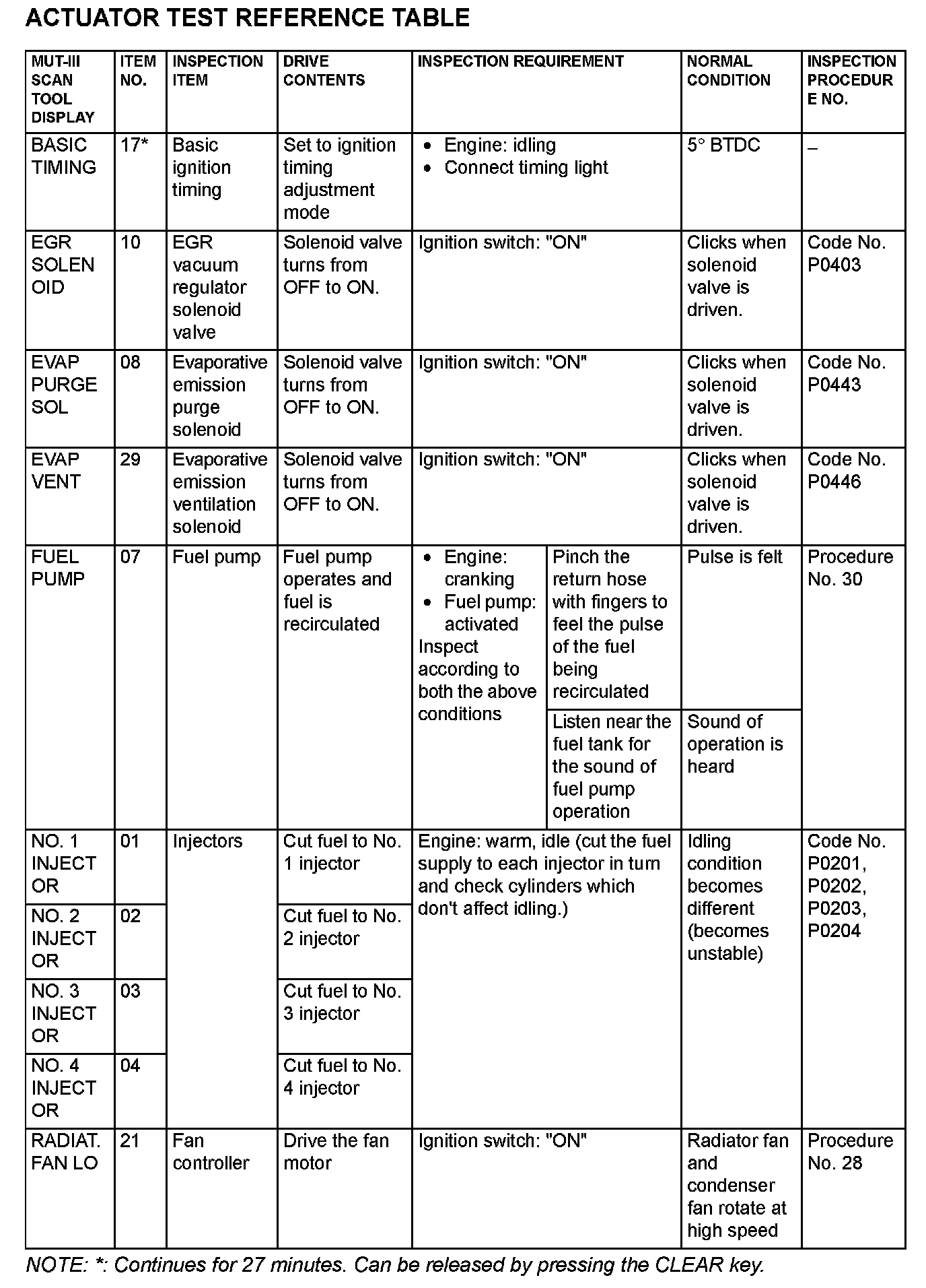 Actuator Test Reference Table: