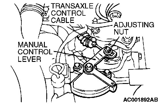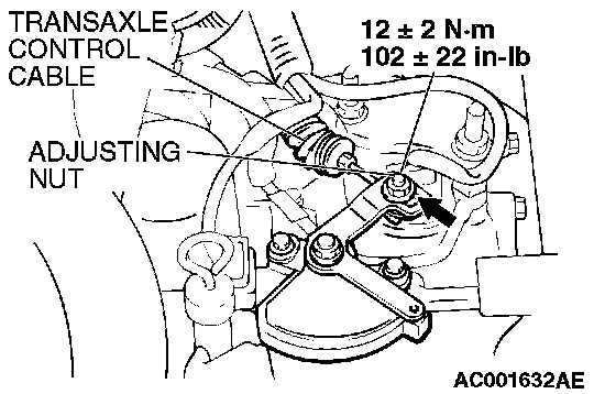 6. Gently push the transaxle control cable in the direction of the arrow, until the cable is taut. Tighten the adjusting nut.