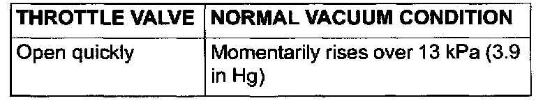 2. Start the engine. As described in the chart, check the vacuum condition when the throttle valve is opened suddenly (rewing) during cold and hot engine conditions.