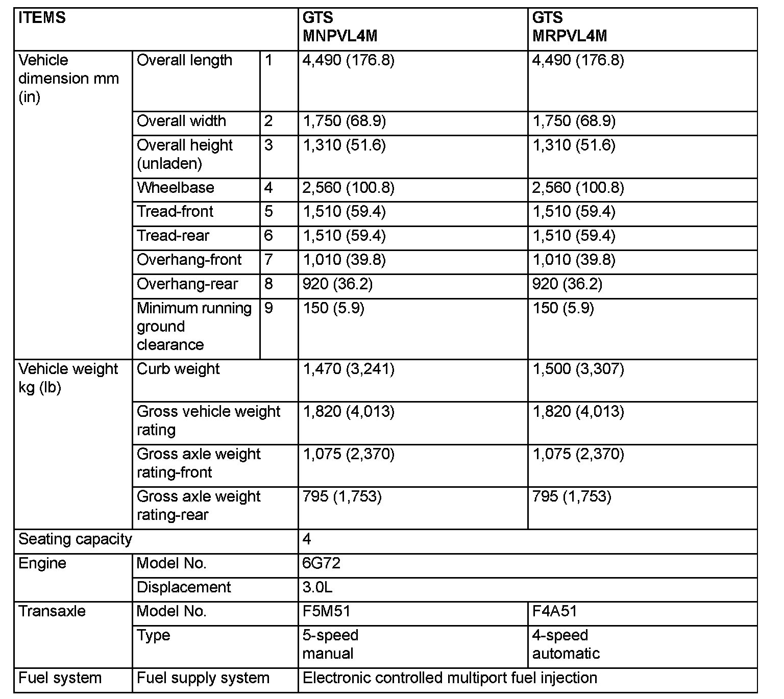 GENERAL SPECIFICATIONS (Model with 3.0L Engine without Variable Induction System)