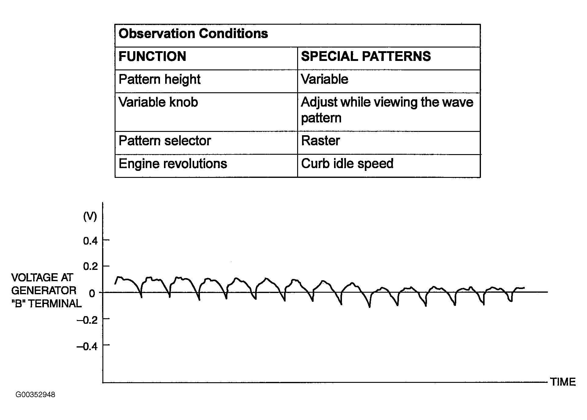 NOTE: The voltage waveform of the generator B terminal can undulate. This waveform is produced when the regulator operates according to fluctuations in the generator load (current), and is normal for the generator. If the ripple height is abnormally high (approximately 2V or more during idling), the wires between the generator B terminal and the battery have broken due to fuse blowing, etc. The generator is usually operating properly.