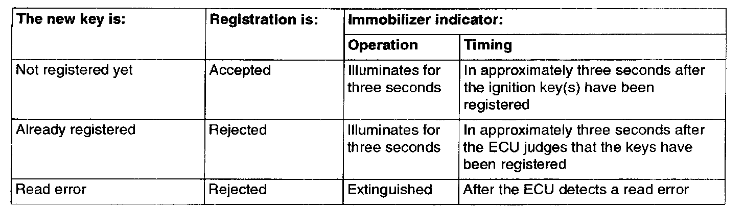 7. The immobilizer-ECU identifies the new key to accept or reject it, and operates the immobilizer indicator (See the table).