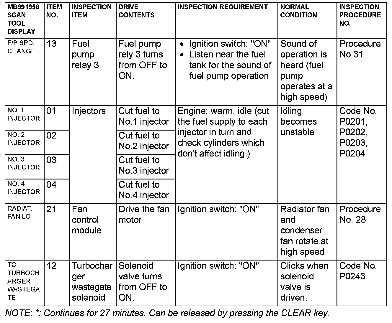 Actuator Test Reference Table