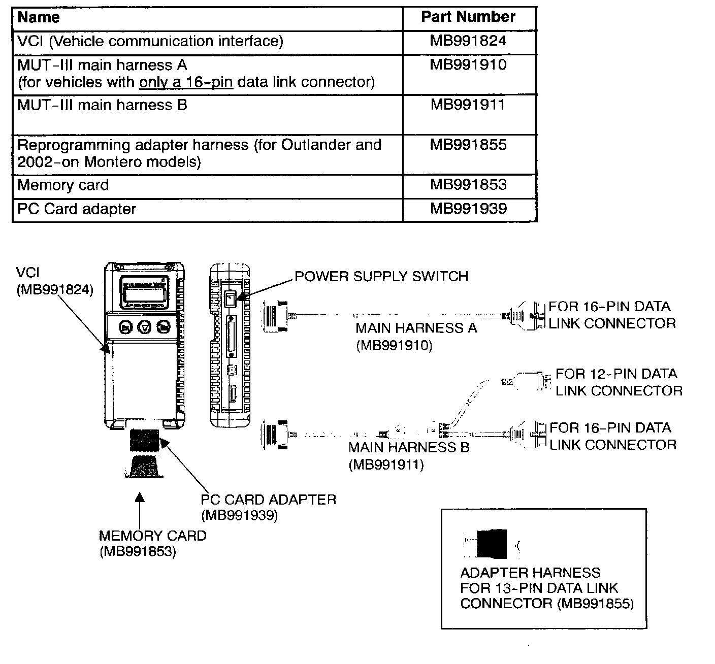 For Outlander and 2002-on Montero models, use 12-pin to 13-pin adapter harness MB991855 to connect the main harness to the data link connector.