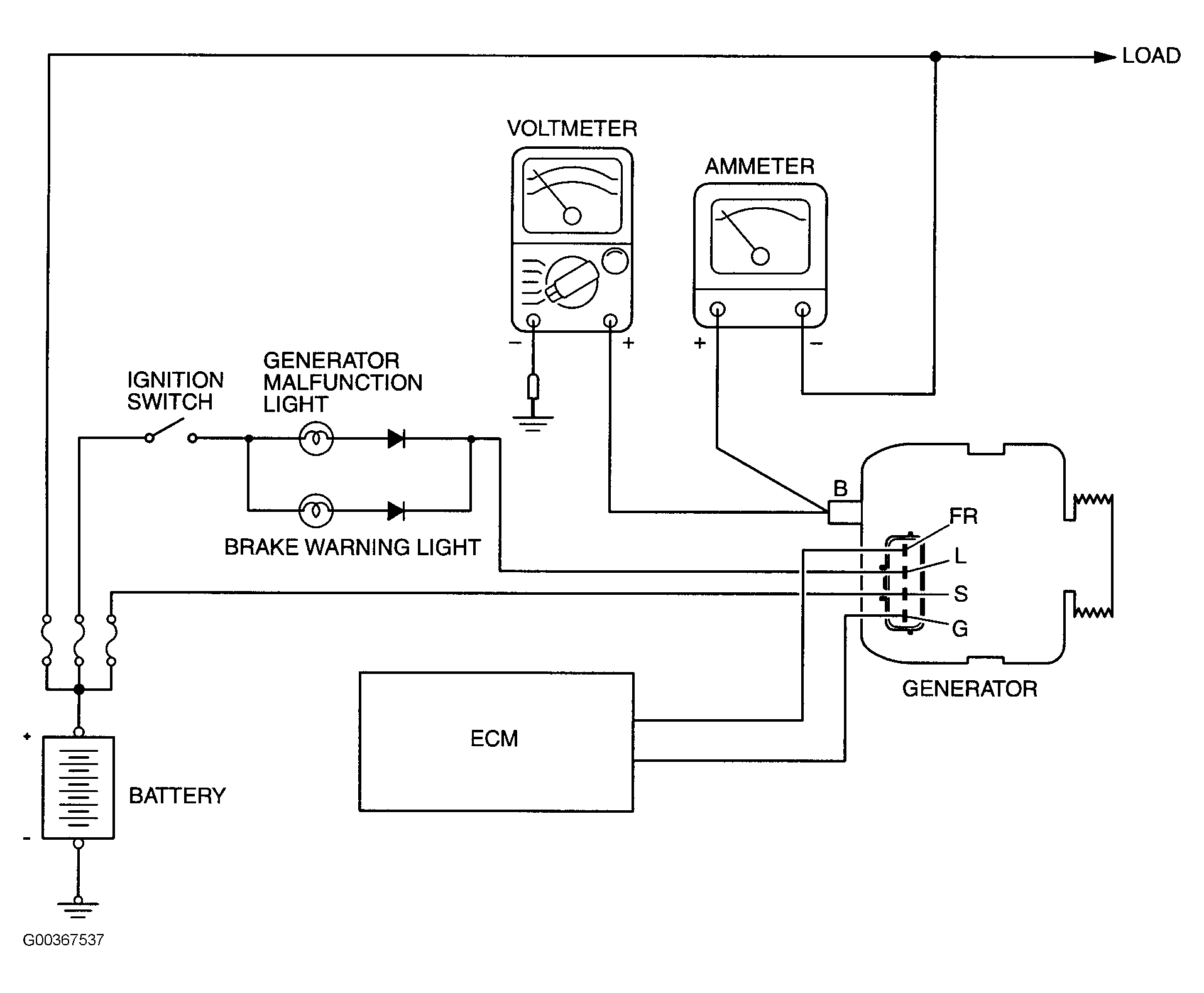 If the voltage is 0 V, the cause is probably an open circuit in the wire or fusible link between the generator B terminal and the battery positive terminal.