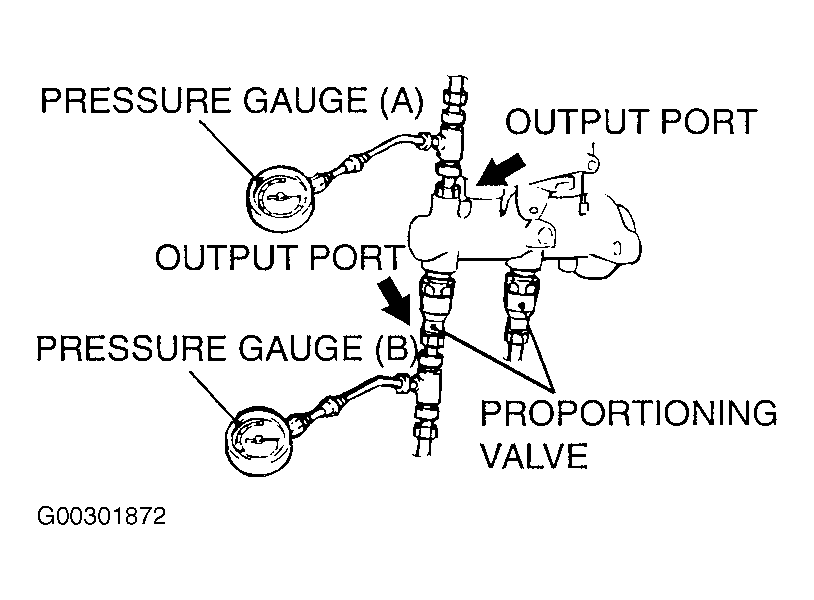 - Connect two pressure gauges to the output port of the master cylinder and output port of the proportioning valve. See Fig 1 .