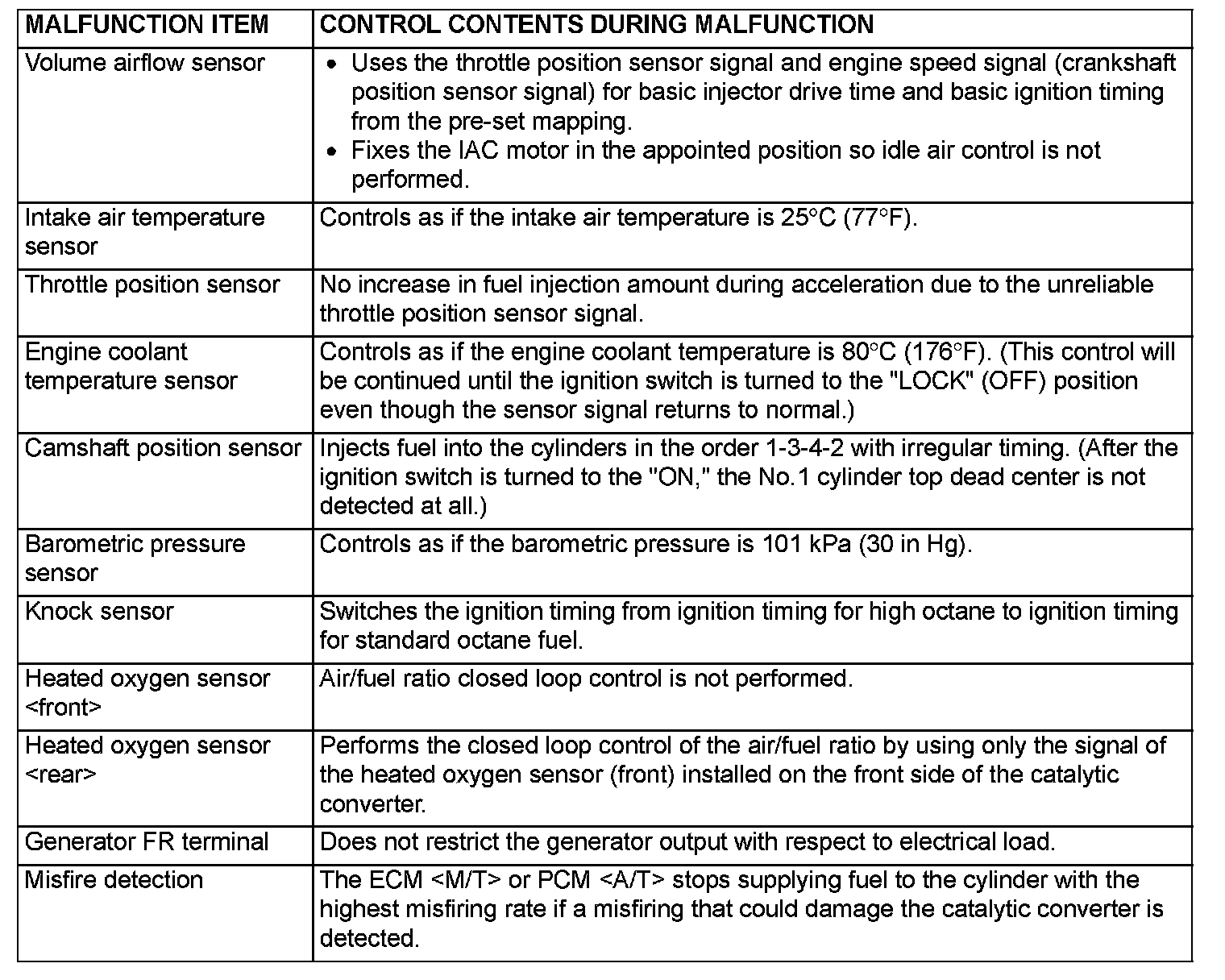 When the main sensor malfunctions are detected by the diagnostic test mode, the vehicle is controlled by means of the given defaults.