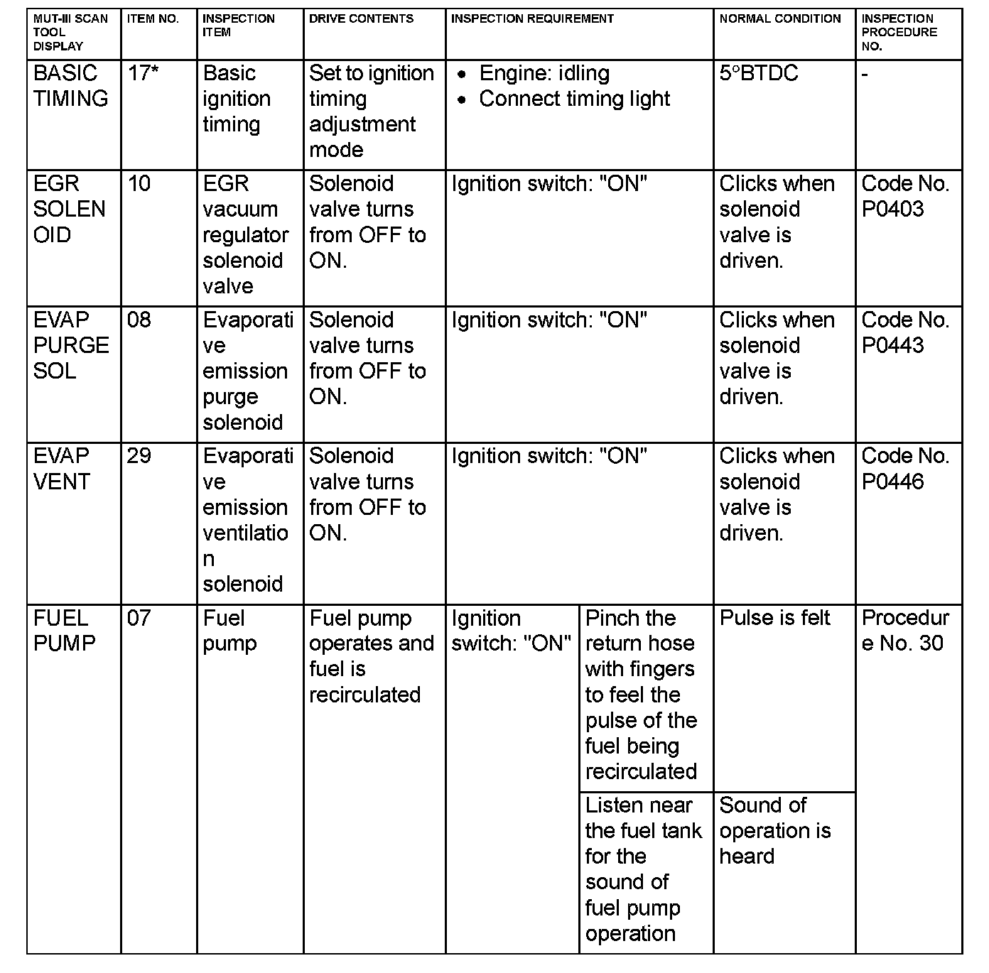 Actuator Test Reference Table