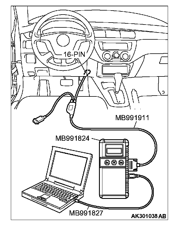 CAUTION: To prevent damage to scan tool MB991958, always turn the ignition switch to the "LOCK" (OFF) position before connecting or disconnecting scan tool MB991958.