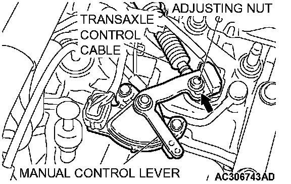 6. Gently push the transaxle control cable in the direction of the arrow, until the cable is taut. Tighten the adjusting nut.