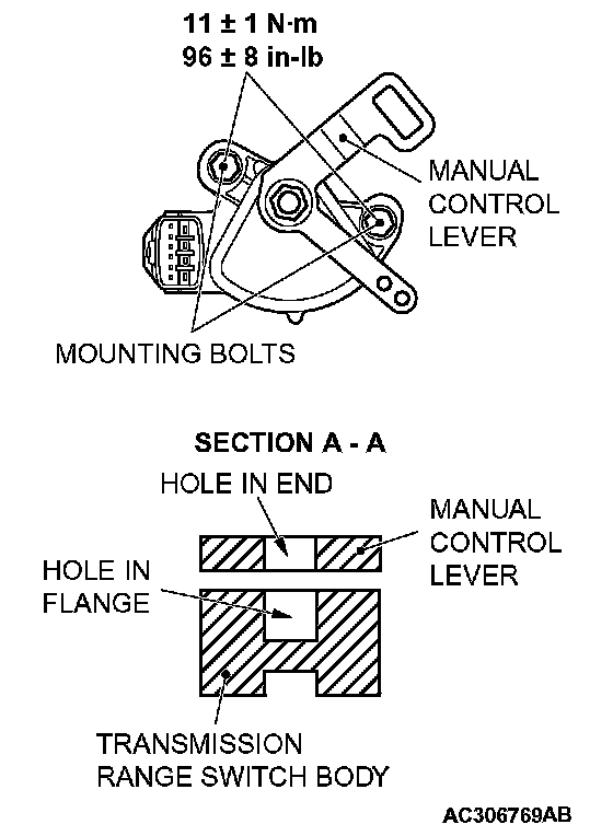 4. Loosen the transmission range switch body mounting bolts and turn the park/neutral position switch body so the hole in the end of the manual control lever and the hole (section A-A in the figure on the left) in the flange of the transmission range switch body flange are aligned.